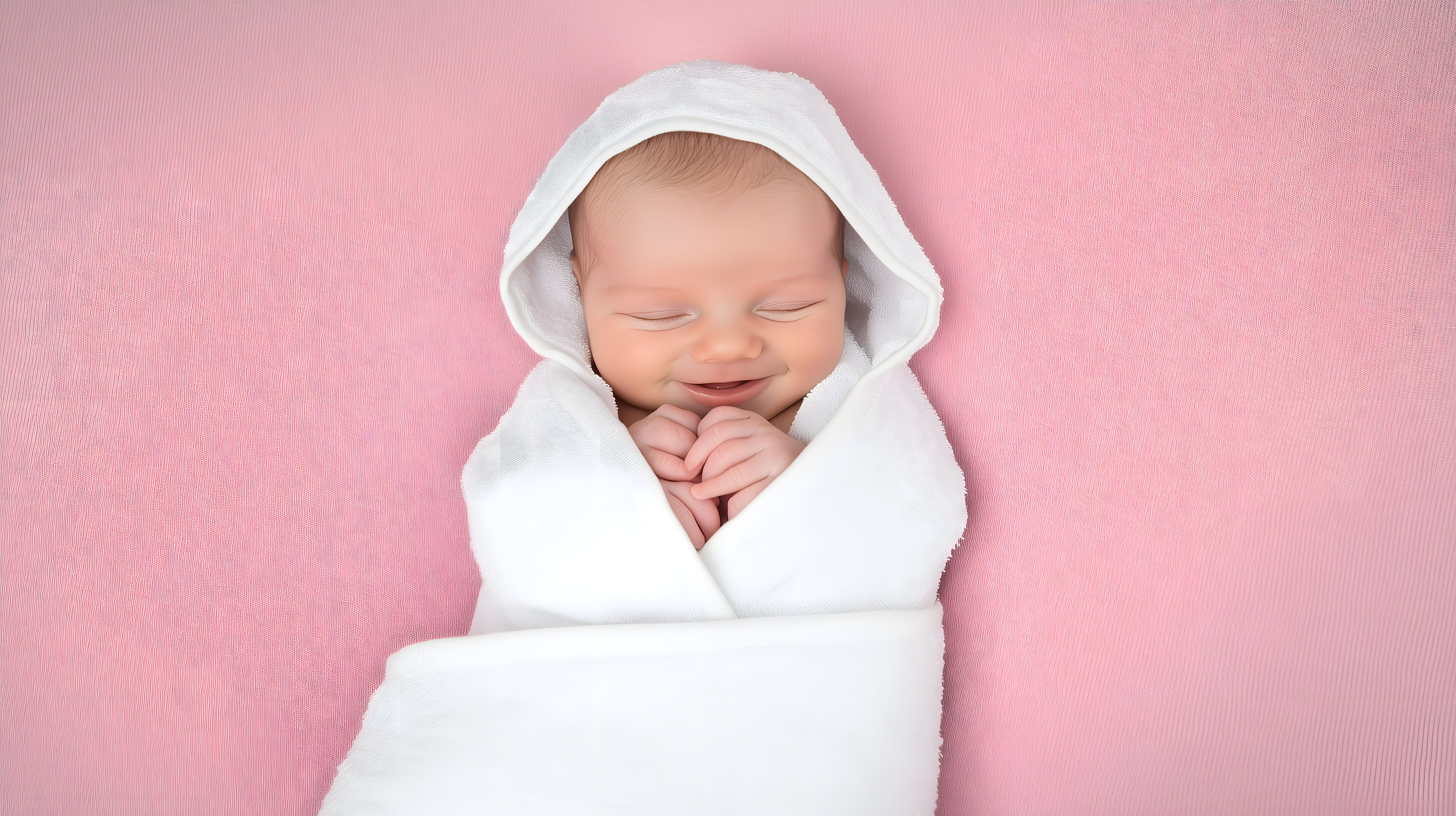 Das Bild zeigt ein süß lächelndes Baby, das in eine weiße, flauschige Decke eingewickelt ist und auf einem rosa Hintergrund liegt. Das Gesicht des Babys ist entspannt und glücklich, die Augen sind leicht geschlossen. Die weiche Textur der Decke und die pastellige Farbgebung verleihen dem Foto eine ruhige, gemütliche Atmosphäre. Dieses hochauflösende Stockfoto in hoher Qualität eignet sich perfekt für die Verwendung in Blogs, Newslettern, Social-Media-Beiträgen oder Werbekampagnen rund um Babyartikel, Elternschaft oder Kinderprodukte. Es steht unter der Creative-Commons-Lizenz zur kostenlosen Nutzung zur Verfügung.
