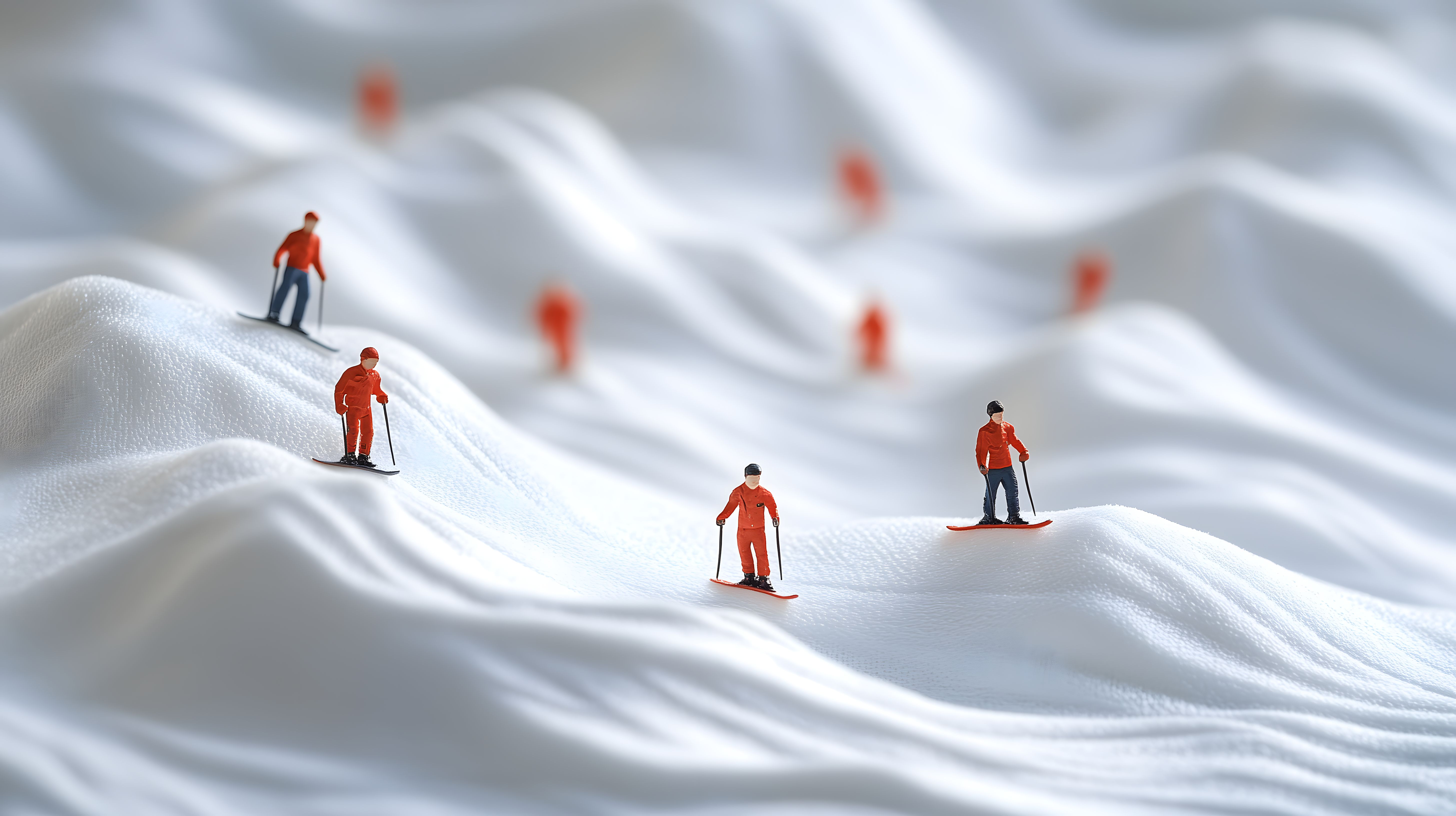 Dieses faszinierende Foto zeigt eine Schar von Miniatur-Skifahrern, die eine schneebedeckte, wellenfömige Piste hinabfahren. Die ungewöhnliche Perspektive und das Spiel mit der Größe verleihen dem Bild einen surrealen, kreativen Charakter. Die winzigen Figuren in ihren roten Anzügen heben sich kontrastreich vom glänzenden Weiß des Schnees ab, was den Eindruck eines winterlichen Sportgeschehens in Miniaturformat verstärkt.