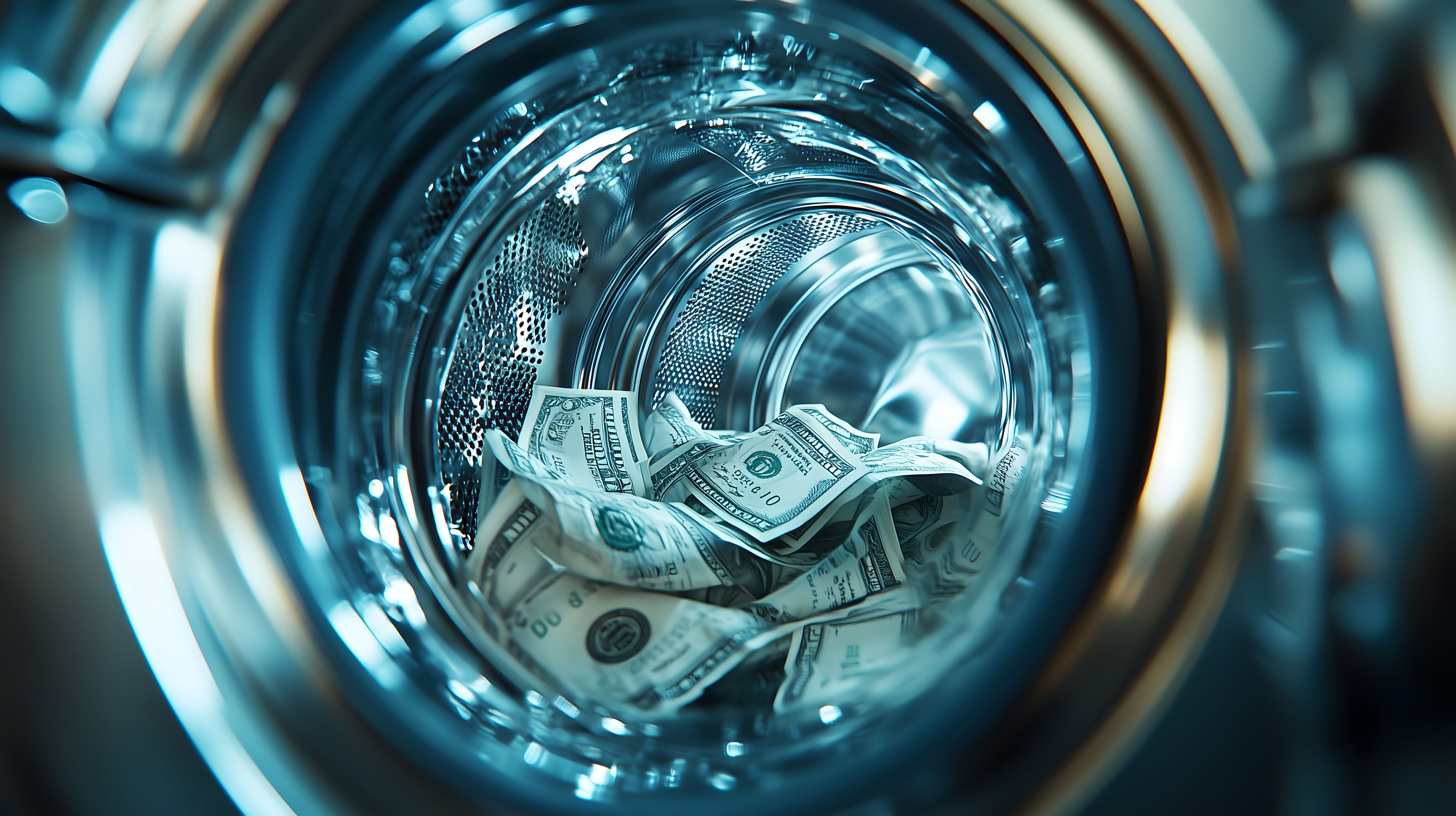 Das Bild zeigt eine Nahaufnahme des Inneren einer Waschmaschine, in der US-Dollarnoten zu sehen sind. Dies dient als visuelles Konzept für das Thema Geldwäsche, bei dem illegale Gelder durch legale Geschäftstätigkeiten geschleust werden. Die Perspektive lässt den Betrachter in die Tiefe der Waschmaschine blicken, wodurch die Dollars deutlich in Szene gesetzt werden. Die Farbgebung in Blautönen verleiht dem Bild eine kühle, technische Anmutung, die zum Thema der Geldwäsche passt. Dieses Stockfoto eignet sich hervorragend für Blogbeiträge, Newsletter-Artikel oder Social-Media-Posts rund um die Themen Finanzen, Wirtschaftskriminalität und Betrug. Es ist in hoher Auflösung verfügbar und unter einer Creative-Commons-Lizenz nutzbar.