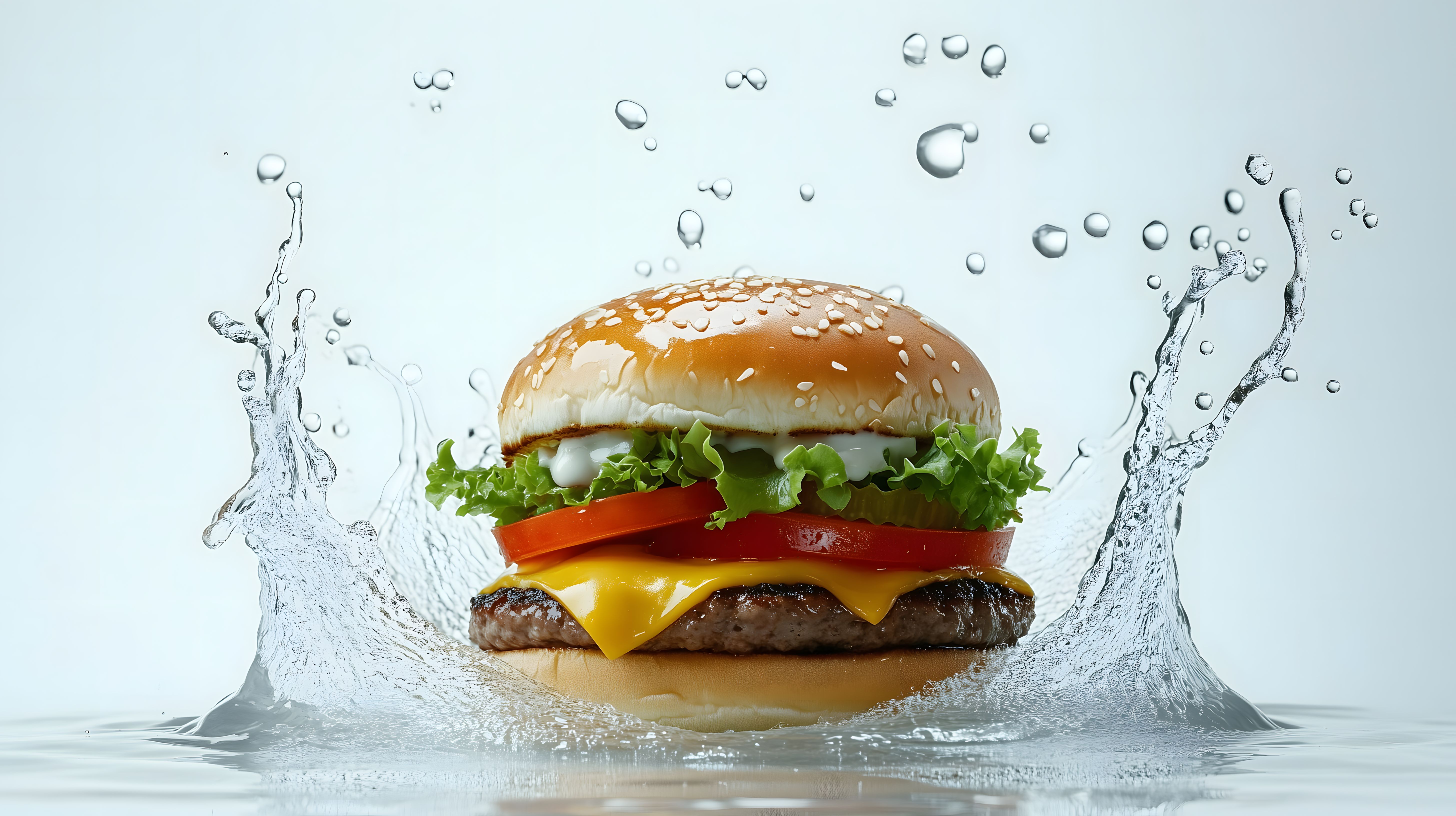 Das Bild zeigt einen leckeren, appetitlich angerichteten Burger, der vor einem weißen Hintergrund auf Wasser schwimmt. Der Burger besteht aus einem knusprigen Brötchen, einer saftigen Fleischfrikadelle, geschmolzenem Käse, Salat und frischen Tomaten. Durch die Wassertropfen, die um den Burger herum spritzen, entsteht ein besonders frischer und erfrischender Eindruck. Dieses Foto eignet sich perfekt für die Verwendung in Lebensmittelwerbung, Kochblogs oder -rezepten sowie für Social-Media-Beiträge rund um das Thema Kulinarik. Als hochwertiges, kostenloses Stockfoto in hoher Auflösung und unter einer Creative-Commons-Lizenz verfügbar, lässt es sich vielfältig einsetzen.
