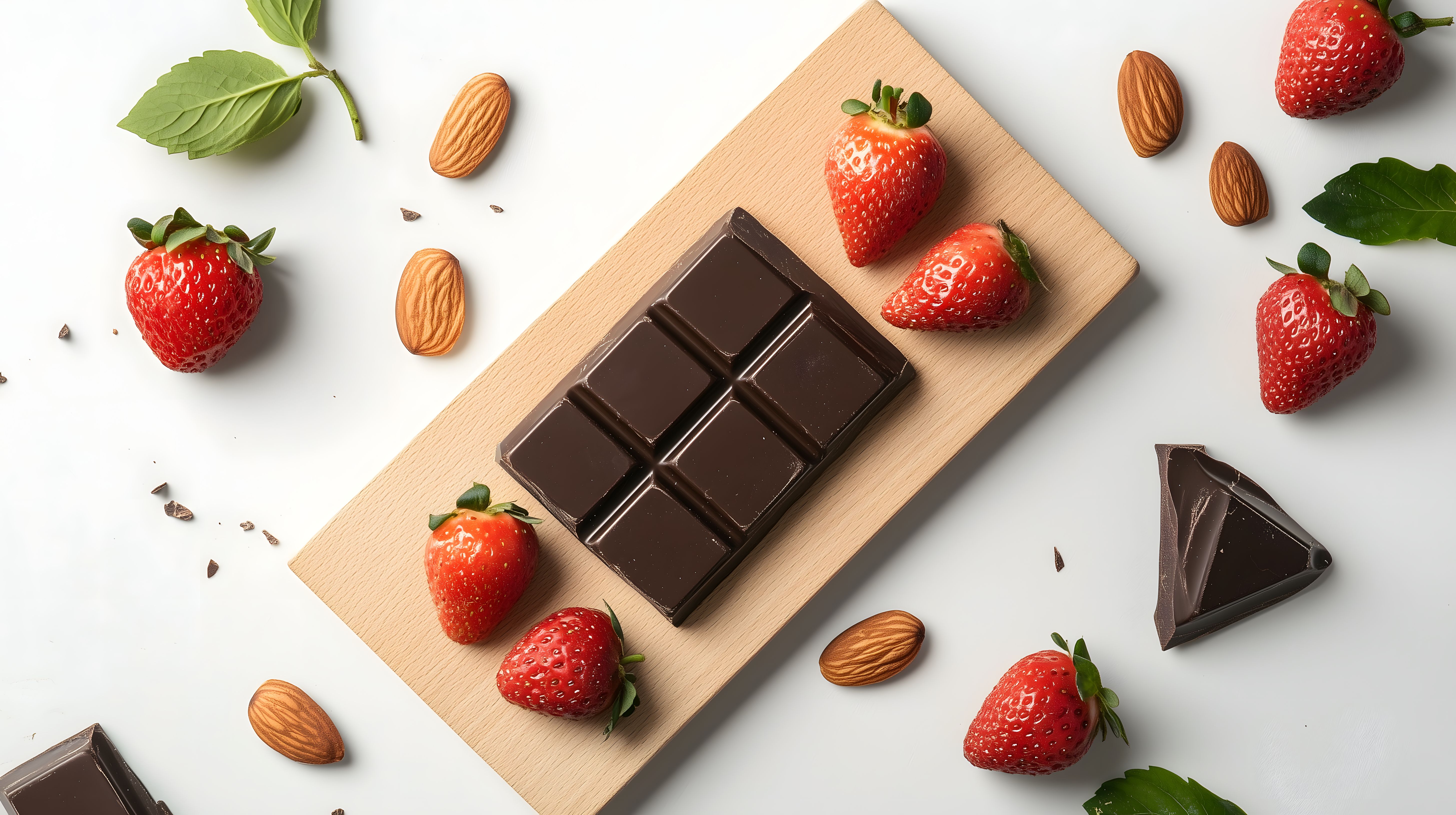 Das Bild zeigt ein minimalistisches Stilleben mit verschiedenen Leckereien wie dunkler Schokolade, saftigen Erdbeeren und knackigen Mandeln. Die Anordnung auf einem Holzbrett in der Draufsicht hebt die Farben, Formen und Texturen der Objekte hervor und erzeugt einen ästhetischen, appetitlichen Gesamteindruck. Dieses Foto eignet sich hervorragend für Werbung, Social-Media-Posts oder Blogbeiträge rund um Lebensmittel, Ernährung und Genuss. Es ist ein hochauflösendes, kostenloses Stockfoto unter der Creative-Commons-Lizenz, das vielfältig eingesetzt werden kann.