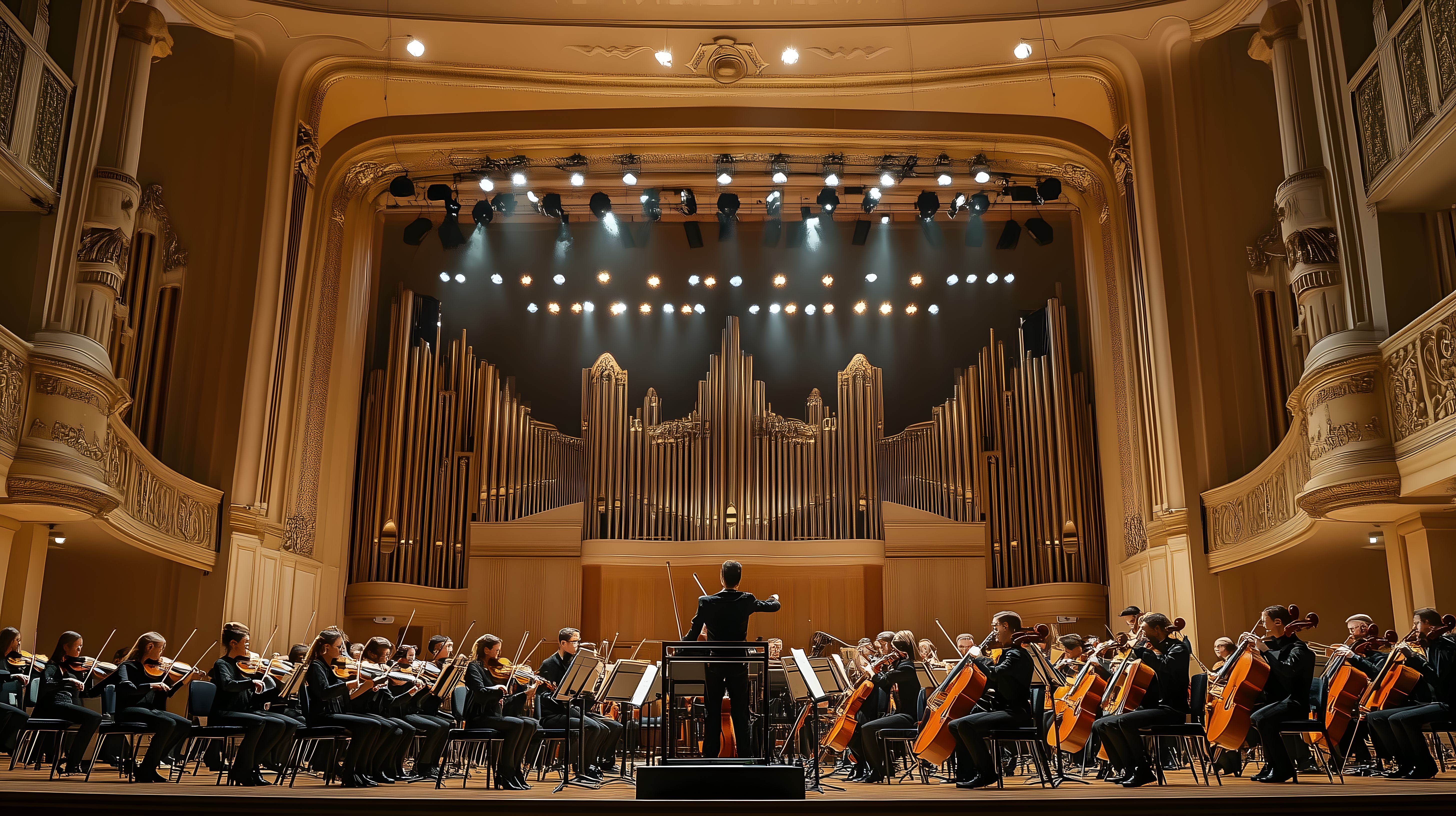 Dieses beeindruckende Foto zeigt ein sinfonisches Orchester auf einer prachtvollen Bühne. Der Dirigent steht im Mittelpunkt und leitet die Musiker, die mit ihren Instrumenten wie Violinen, Cellos und Bläsern konzentriert spielen. Die opulente Architektur des Aufführungsorts mit ihren detaillierten Verzierungen und der wirkungsvollen Beleuchtung schaffen eine stimmungsvolle Atmosphäre. Dieses Bild eignet sich hervorragend als Hintergrundbild für Blogs, Newsletter oder Social-Media-Beiträge rund um klassische Musik, Kulturevents oder Konzerte. Als hochwertiges, kostenloses Stockfoto unter Creative-Commons-Lizenz kann es frei für verschiedenste Zwecke verwendet werden.