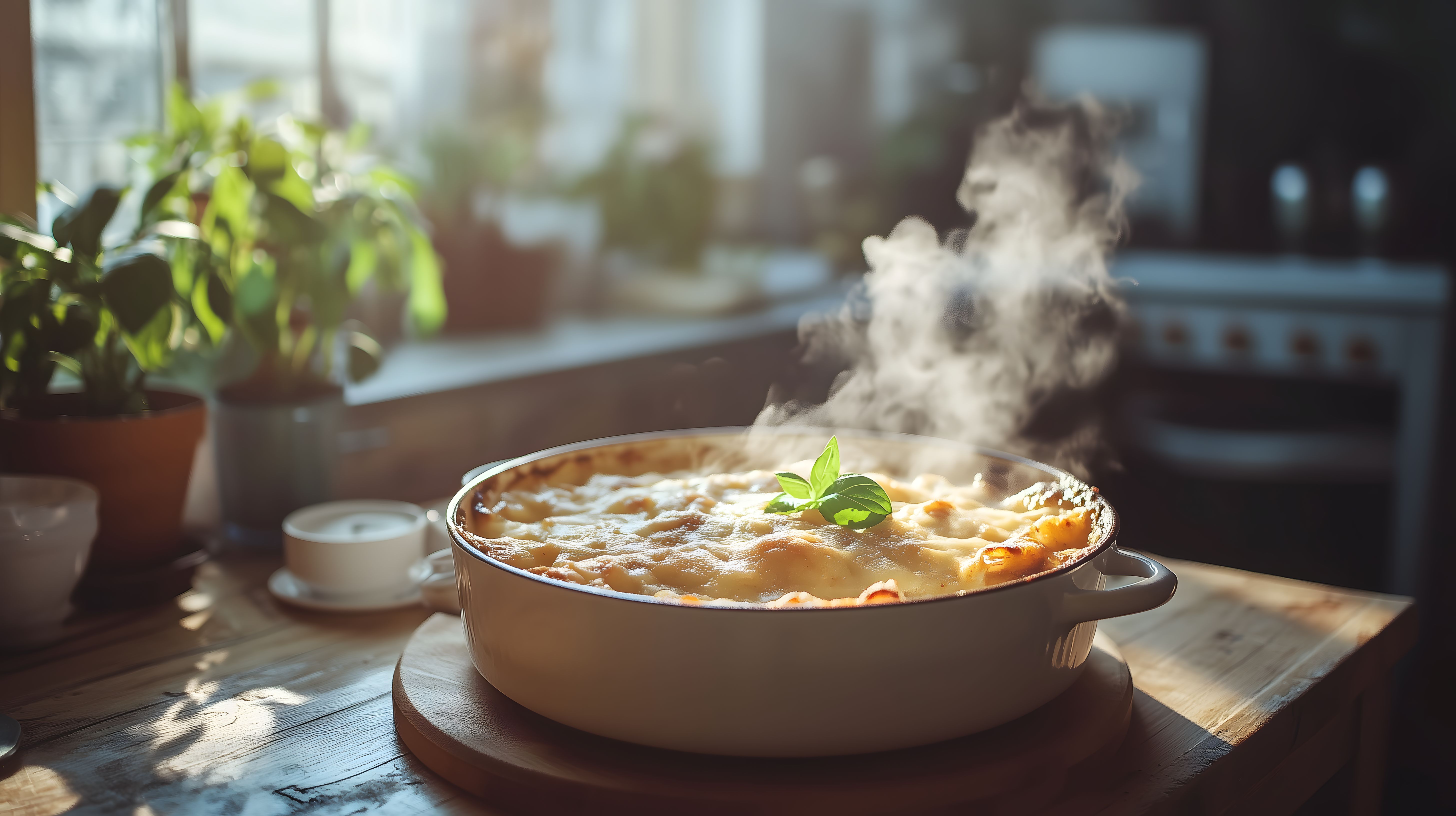 Das Bild zeigt einen köstlich dampfenden Nudelauflauf in einer rustikalen Servierschale, angerichtet auf einem hölzernen Tisch in einem gemütlichen Wohnambiente. Der Auflauf ist frisch aus dem Ofen gekommen und verströmt einen verlockenden Duft. Grüne Kräuter, vermutlich Basilikum, verleihen dem Gericht einen frischen, aromatischen Akzent. Die Szene ist stimmungsvoll durch das warme Licht und die Fensterrahmen mit Blick auf die Natur draußen. Dieses Foto eignet sich hervorragend als kostenloses Stockfoto für Rezept-Blogs, Kochbücher, Werbung für Haushaltsprodukte oder Social-Media-Posts rund ums Thema Kochen und Genießen. Die hochwertige Auflösung und Creative-Commons-Lizenz machen es zu einem vielseitig einsetzbaren Bildmotiv.