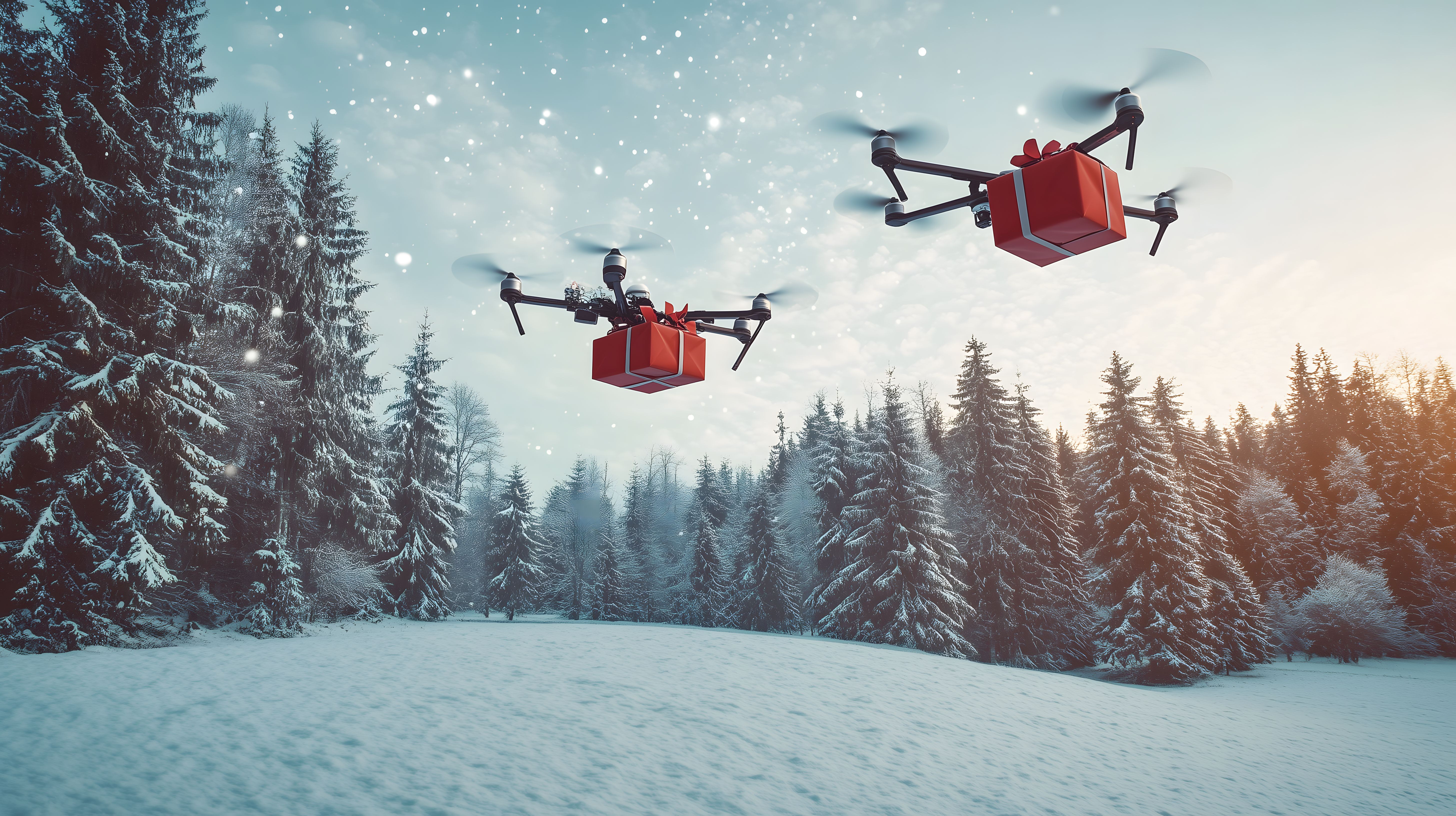 Das Foto zeigt eine winterliche Waldlandschaft mit verschneiten Bäumen. In der Luft schweben mehrere Drohnen mit roten Geschenkboxen, die offensichtlich Pakete ausliefern. Die Szenerie hat einen futuristischen, fast märchenhaften Charakter - eine moderne Interpretation der Weihnachtsmann-Legende. Das Bild eignet sich hervorragend für Weihnachts-Blogs, Newsletter oder Social-Media-Posts zum Thema Technologie, Logistik oder innovativer Einzelhandel. Als kostenloses Stockfoto in hoher Auflösung und unter Creative-Commons-Lizenz bietet es vielfältige Einsatzmöglichkeiten.
