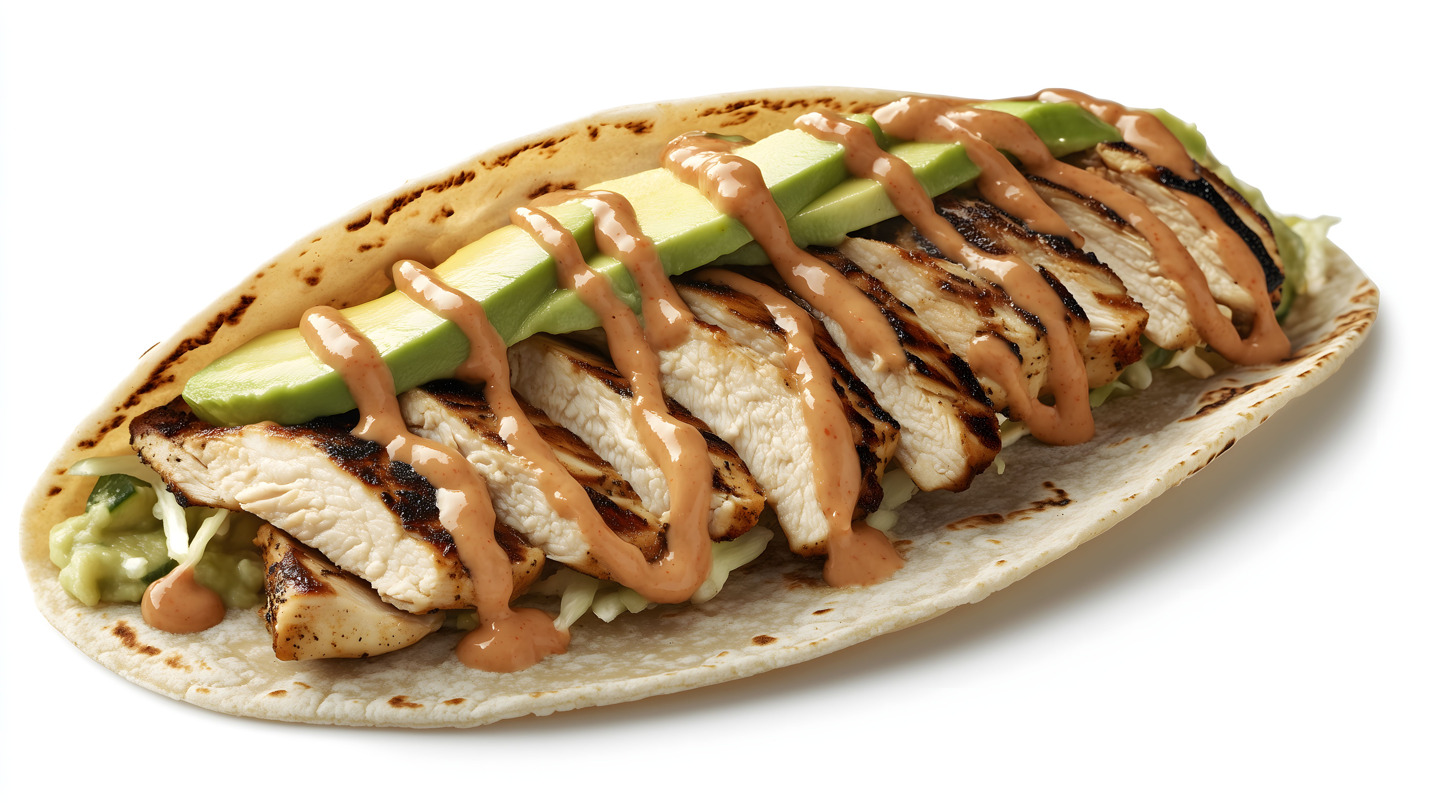 Dieses Foto zeigt einen leckeren mexikanischen Taco mit gegrilltem Hähnchen und Avocado. Der Taco ist auf einem weißen Hintergrund platziert, wodurch die knackigen, frischen Zutaten besonders gut zur Geltung kommen. Das Hähnchen ist perfekt gegrillt und wird von der cremigen Avocado und einer dekorativen Soße ergänzt, die einen geschmackvollen Kontrast bildet. Dieses Bild ist ideal für Werbung, Blogs oder soziale Medien rund um mexikanische Küche, Street Food oder leckere Snackideen. Als hochwertiges Stockfoto in hoher Auflösung und unter Creative-Commons-Lizenz ist es kostenlos für vielfältige Einsatzzwecke verfügbar.