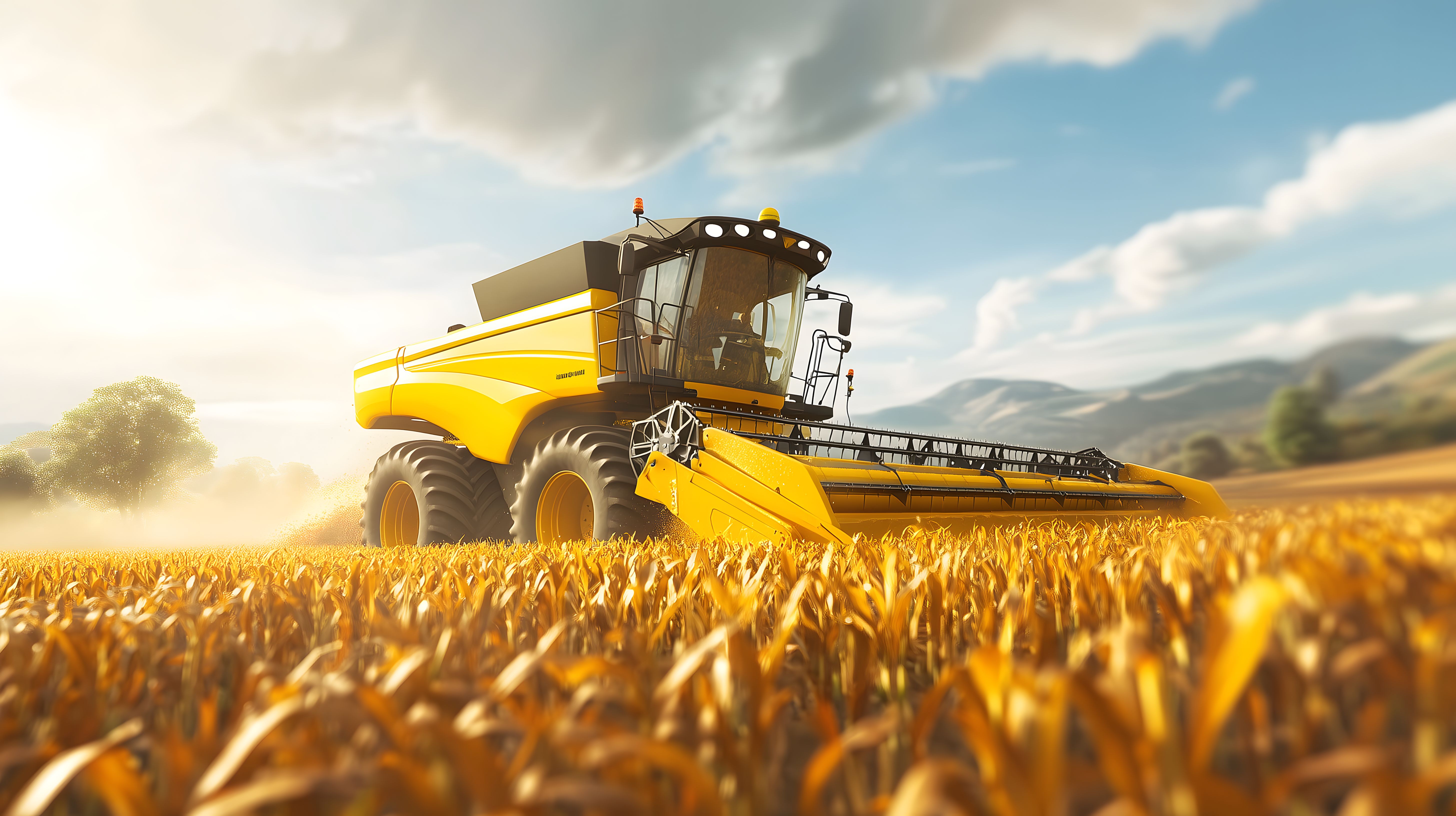Das Bild zeigt einen modernen Mähdrescher, der auf einem weiten Weizenfeld bei Sonnenuntergang arbeitet. Die leuchtend gelben Weizenähren bilden einen schönen Kontrast zu dem strahlend blauen Himmel mit weißen Wolken. Der riesige Erntekomplex fährt langsam durch das Feld und erntet das reife Getreide mit seiner mächtigen Maschine. Diese Szene ist typisch für die Erntezeit in der Landwirtschaft und zeigt die Effizienz und Produktivität der modernen Agrartechnik.
