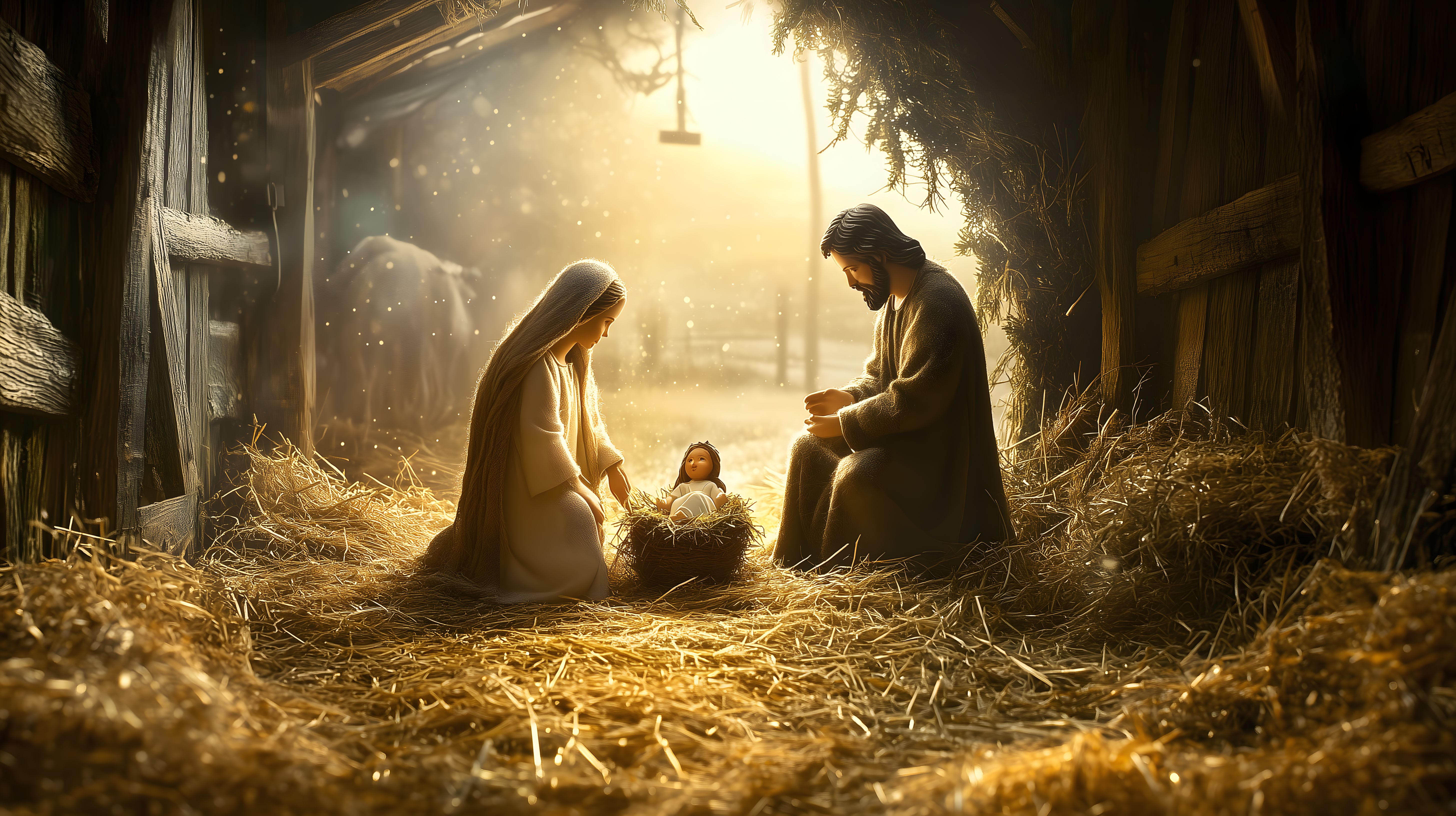 Dieses stimmungsvolle Foto zeigt die Heilige Familie - Maria, Josef und das Jesuskind - in einer rustikalen Weihnachtskrippe. Die Szene spielt in einem urigen Holzschuppen, der vom warmen, goldenen Licht durchflutet wird. Die liebevolle Darstellung der drei Figuren, umgeben von Stroh und Holzbalken, vermittelt eine andächtige, fast mystische Atmosphäre. Dieses Bild eignet sich hervorragend für den Einsatz in Weihnachtsdekorationen, Grußkarten, Blogbeiträgen oder Social-Media-Posts rund um das Fest der Geburt Christi. Als kostenloses Stockfoto in hoher Auflösung und unter Creative-Commons-Lizenz steht es für vielfältige Verwendungszwecke zur Verfügung.