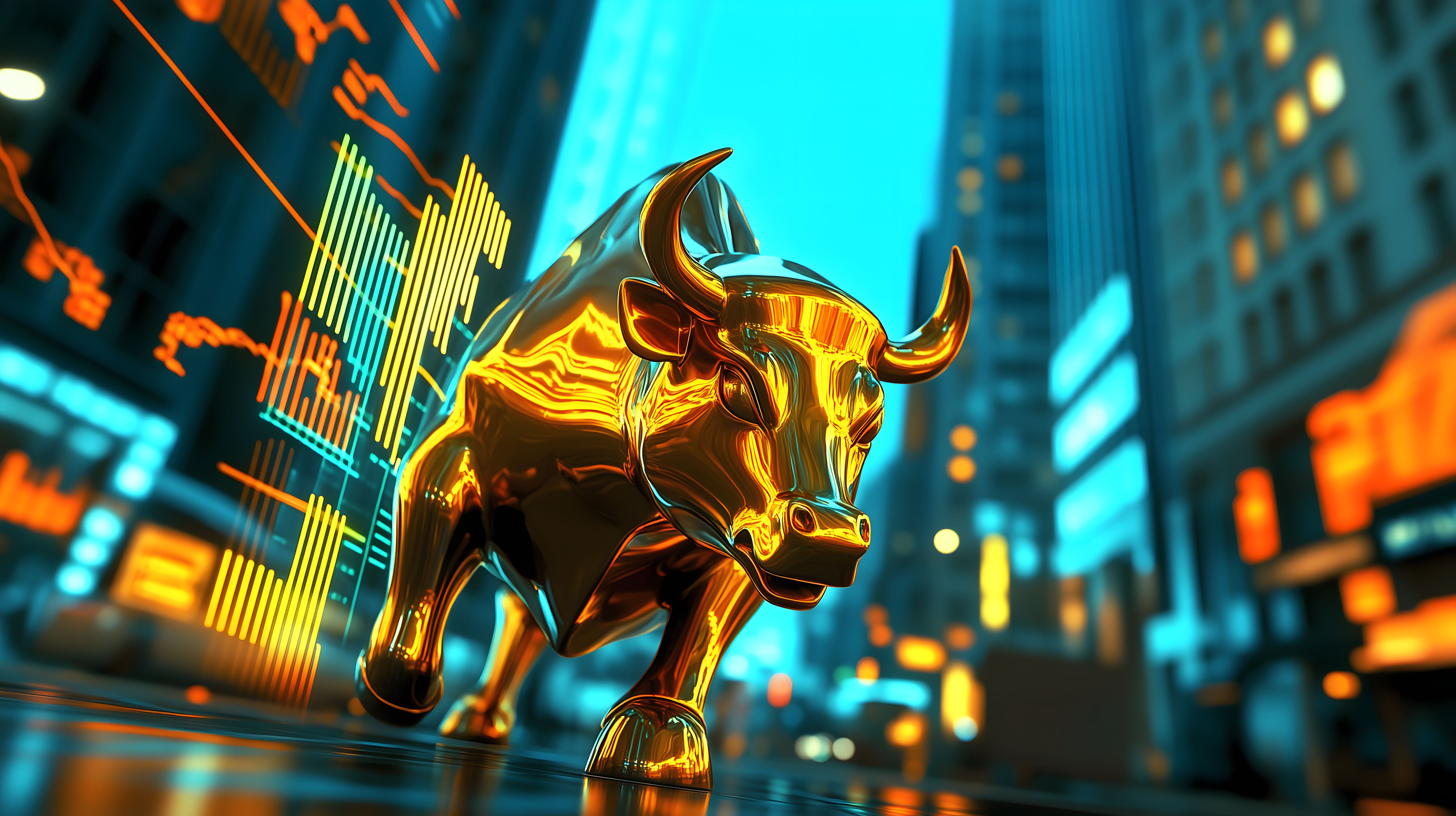 Das Bild zeigt eine beeindruckende goldene Bullenstatue, die vor einer nächtlichen Großstadtkulisse positioniert ist. Die Stadt wird von bunten Neonlichtern erhellt, die eine dynamische und technologische Atmosphäre verleihen. Der Bulle als Symbol der Finanzmärkte und der Börsenentwicklung steht im Mittelpunkt der Aufnahme und strahlt eine starke, kraftvolle Präsenz aus.
