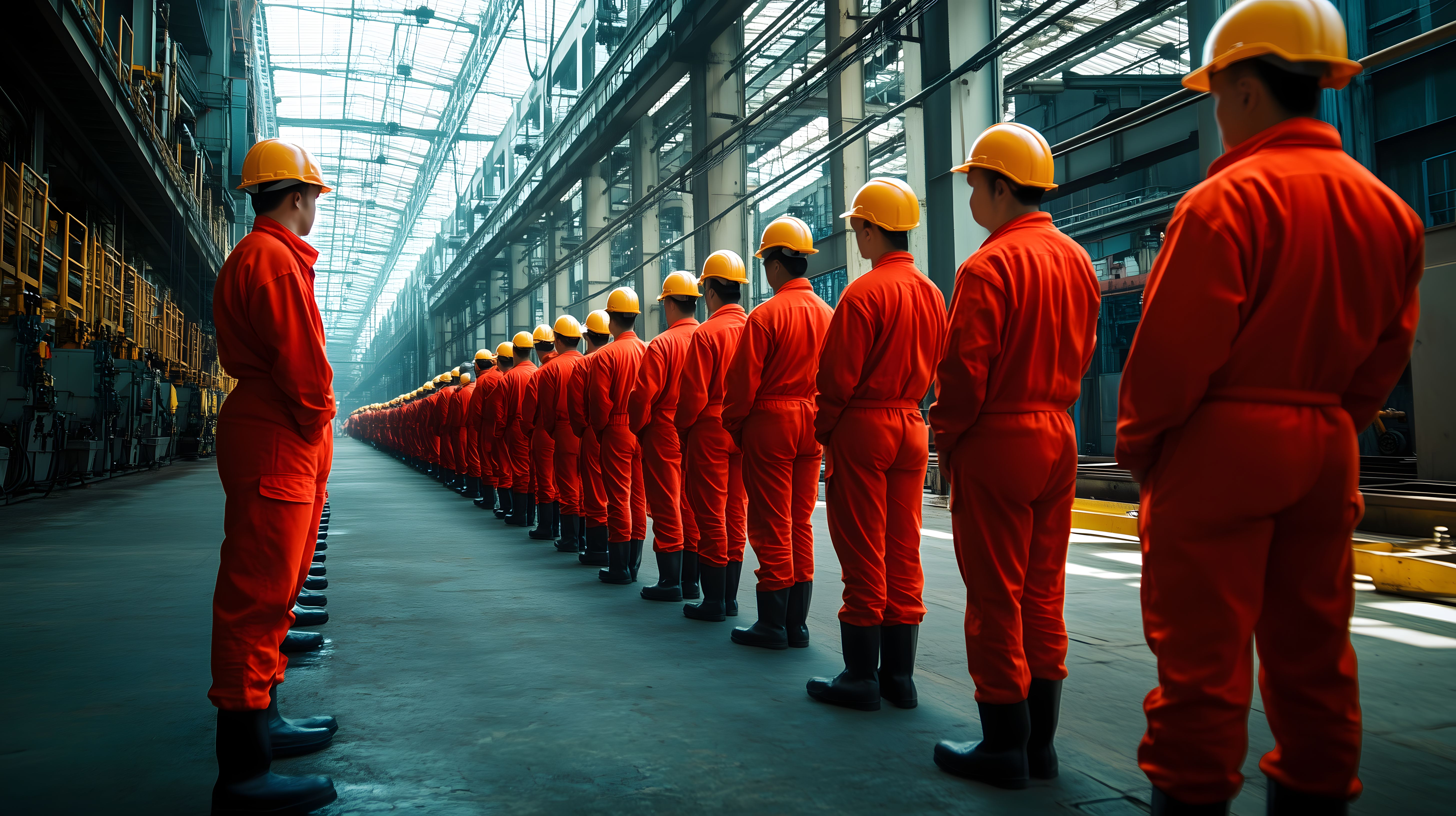 Dieses Foto zeigt eine Reihe von Arbeitern in roten Overalls, die in einer modernen, hellen Industriehalle stehen. Die Arbeiter tragen orange Schutzhelme und stehen in einer symmetrischen Formation, was einen Eindruck von Ordnung und Effizienz vermittelt. Die Halle ist durch große Glasflächen lichtdurchflutet und wirkt modern und aufgeräumt. Das Bild eignet sich hervorragend als kostenloses, hochauflösendes Stockfoto für Blog-Beiträge, Newsletter oder Social-Media-Kanäle rund um Themen wie Industriekultur, Produktion oder Arbeitswelt.