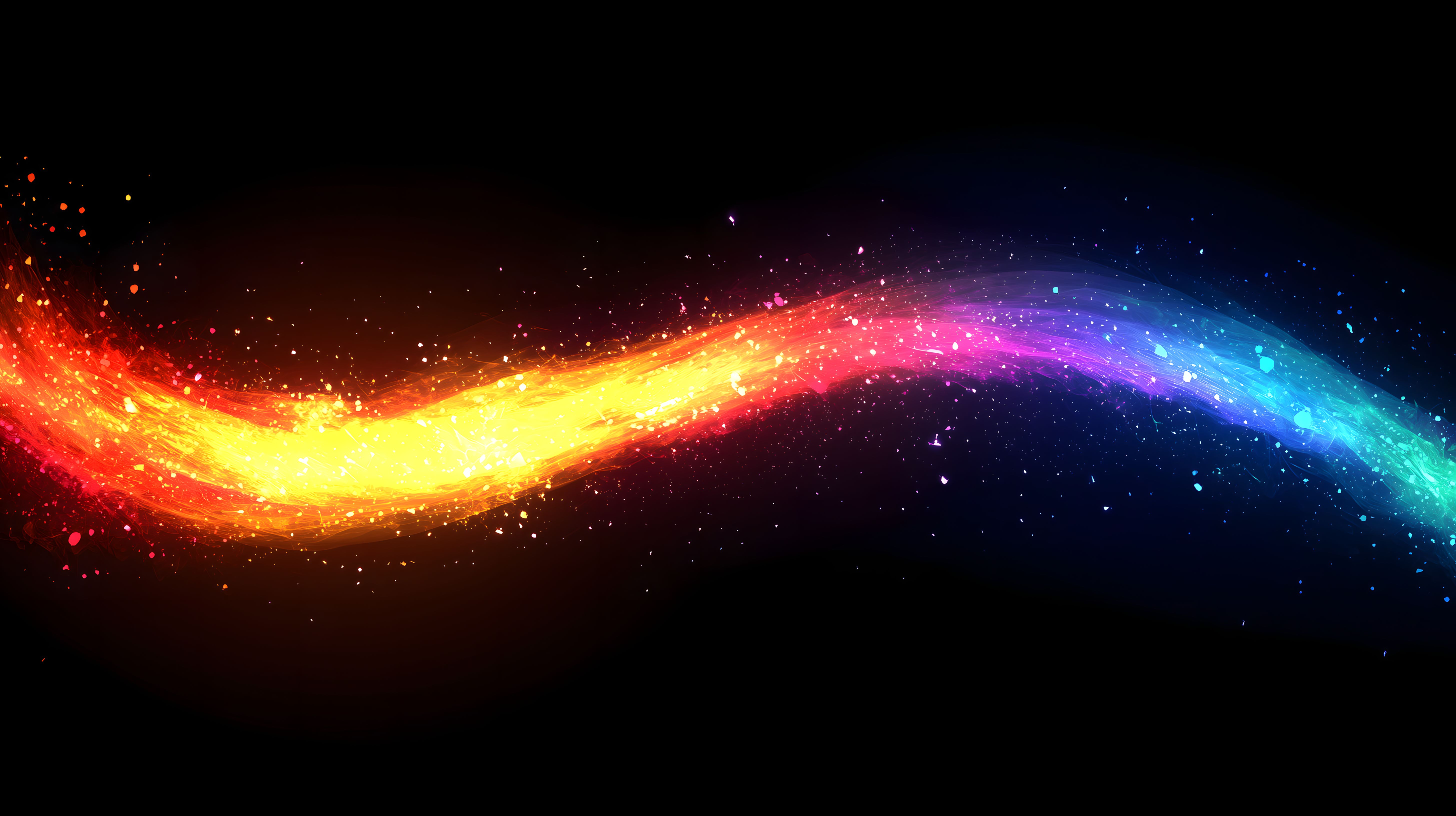Dieses eindrucksvolle Foto zeigt eine abstrakte Farbwelle, die sich mit leuchtenden Partikeln über einem dunklen Hintergrund erstreckt. Die Welle erstrahlt in einem bunten Farbspektrum, das von feurigem Rot über leuchtendes Gelb bis hin zu strahlendem Blau reicht. Die funkelnden Partikel verleihen der Szene eine magische und mystische Anmutung, die den Betrachter in ihren Bann zieht.