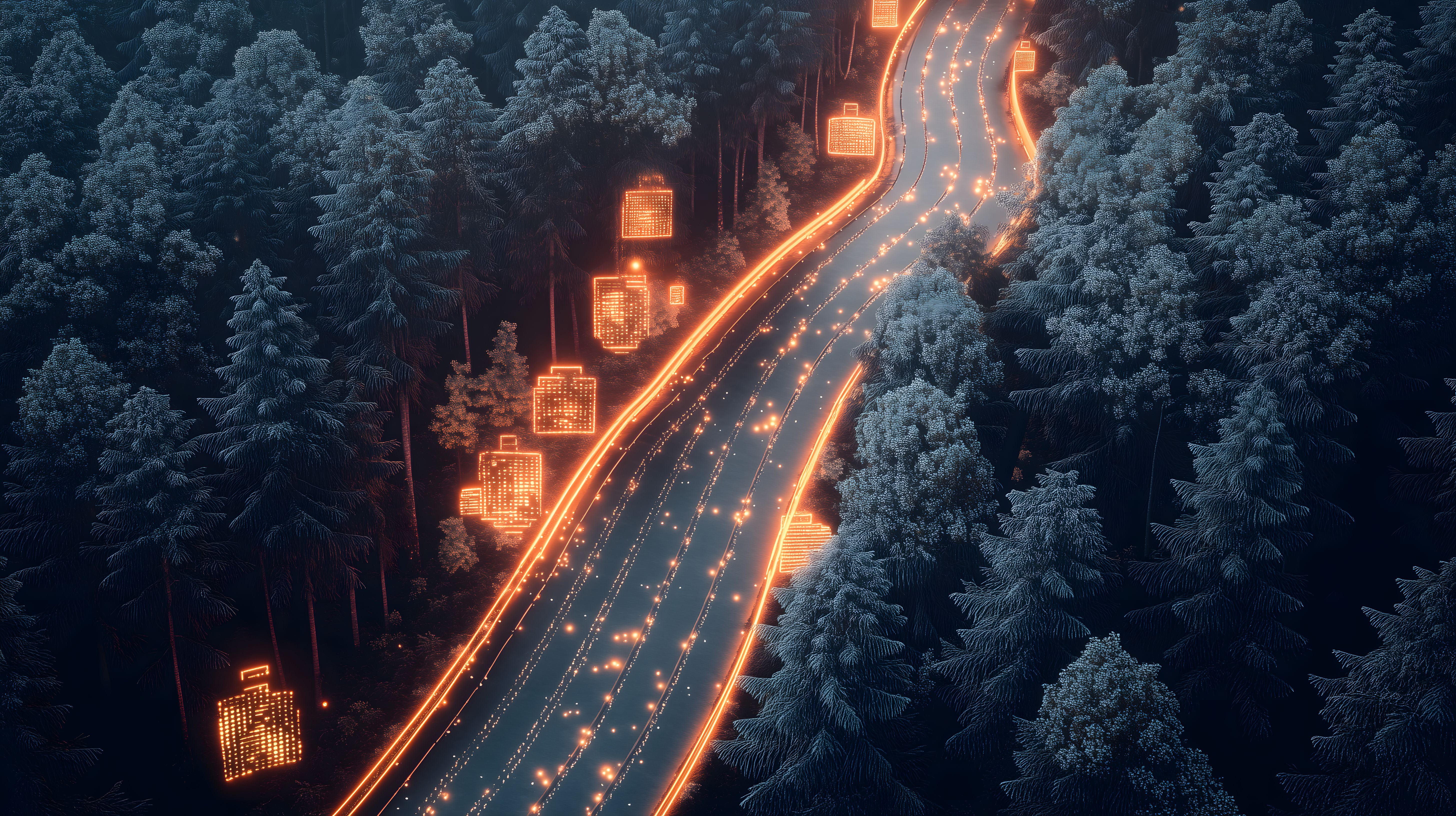Dieses beeindruckende Stockfoto zeigt eine verschneite Winterlandschaft aus der Vogelperspektive. Eine kurvenreiche Straße schlängelt sich durch den verschneiten Wald, gesäumt von mächtigen Bäumen. Die Straße ist mit einer Reihe leuchtender Lichterketten geschmückt, die eine romantische und festliche Atmosphäre erzeugen. Das Bild vermittelt eine Stimmung von Ruhe, Kälte und Besinnlichkeit. Es eignet sich hervorragend für den Einsatz in Werbematerialien, Blogs, Social-Media-Kanälen und Websites, die eine winterliche, digitalisierte Ästhetik vermitteln möchten. Dieses hochauflösende Foto steht unter einer Creative-Commons-Lizenz zur kostenlosen Nutzung zur Verfügung.