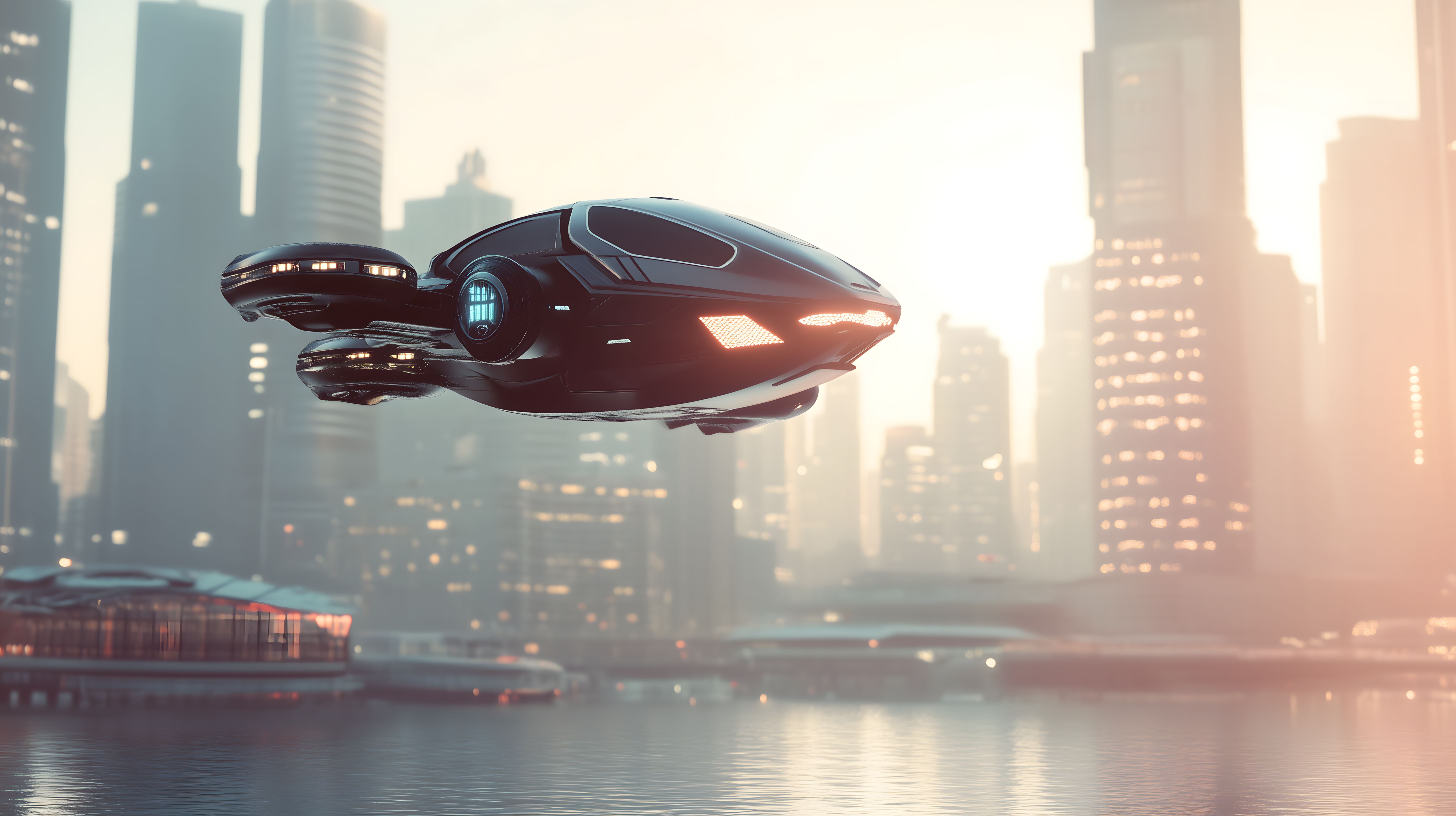 Dieses faszinierende Renderingbild zeigt ein futuristisches Flugfahrzeug, das über eine moderne Großstadt schwebt. Die Skyline ist geprägt von imposanten Wolkenkratzern, deren Lichter sich im Wasser des Hafens spiegeln. Das Fahrzeug hat eine aerodynamische, organisch geformte Silhouette und scheint mühelos durch die Luft zu gleiten. Die Szenerie vermittelt eine Zukunftsvision von fortschrittlicher Mobilität und Technologie, die die Städte der Zukunft prägen könnte. Dieses hochauflösende Stockfoto im Creative-Commons-Stil eignet sich hervorragend für den Einsatz in Blogbeiträgen, Newslettern oder Werbematerialien mit Fokus auf Zukunftsthemen, Stadtentwicklung oder innovative Verkehrskonzepte.