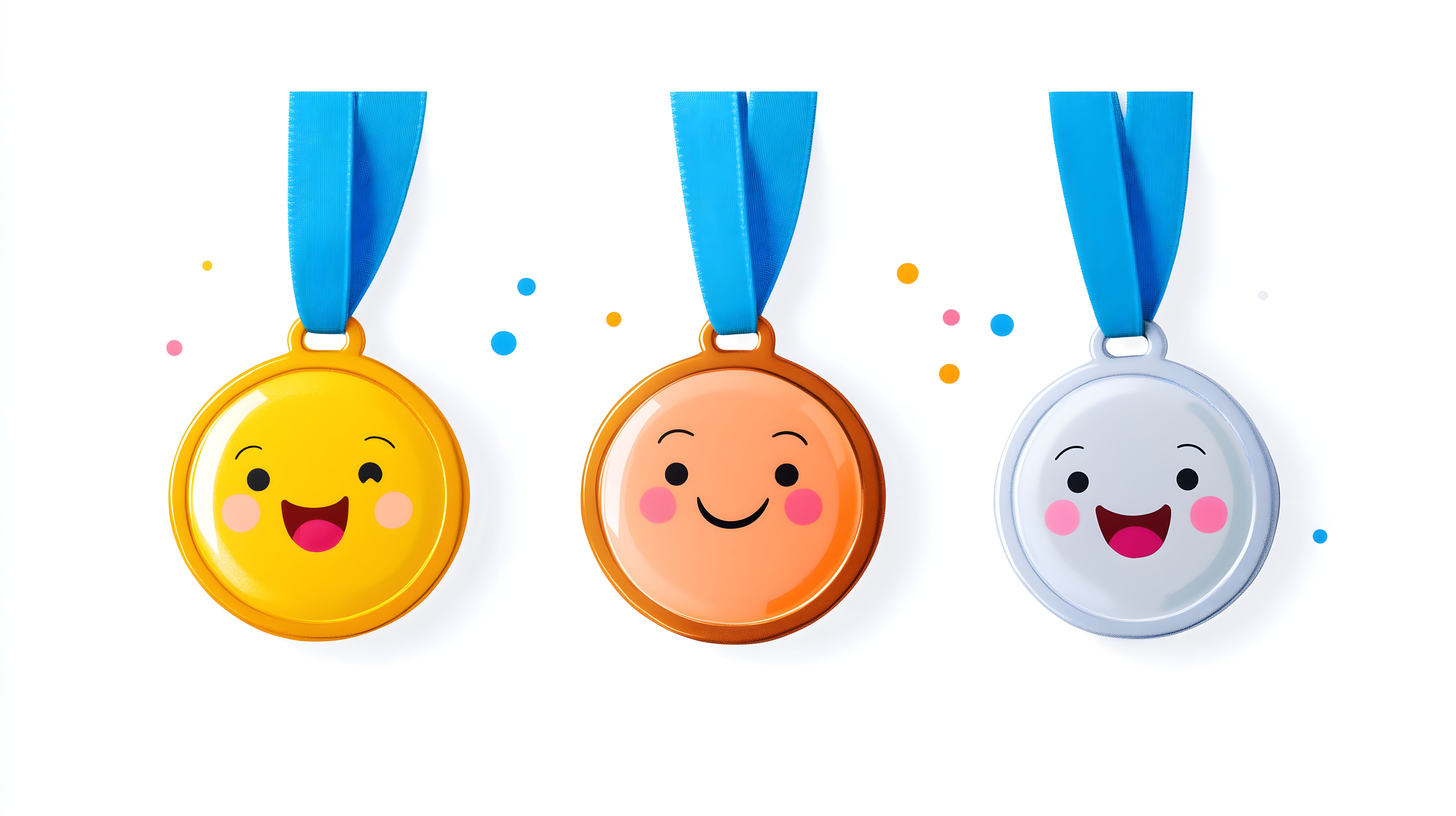 Dieses fröhliche Stockfoto zeigt drei bunte, lächelnde Cartoon-Medaillen in Gold, Orange und Silber, die an blauen Bändern hängen. Die Medaillen haben lustige, freundliche Gesichtsausdrücke und sind von bunten Konfetti-Punkten umgeben. Das Bild eignet sich hervorragend für die Verwendung in Blogbeiträgen, Newslettern, Social-Media-Posts oder Werbematerialien zu Themen wie Sieger, Preisverleihungen, Erfolg und Motivation. Das hochauflösende Foto ist in hoher Qualität und unter der Creative-Commons-Lizenz für eine kostenlose, kommerzielle Nutzung verfügbar.