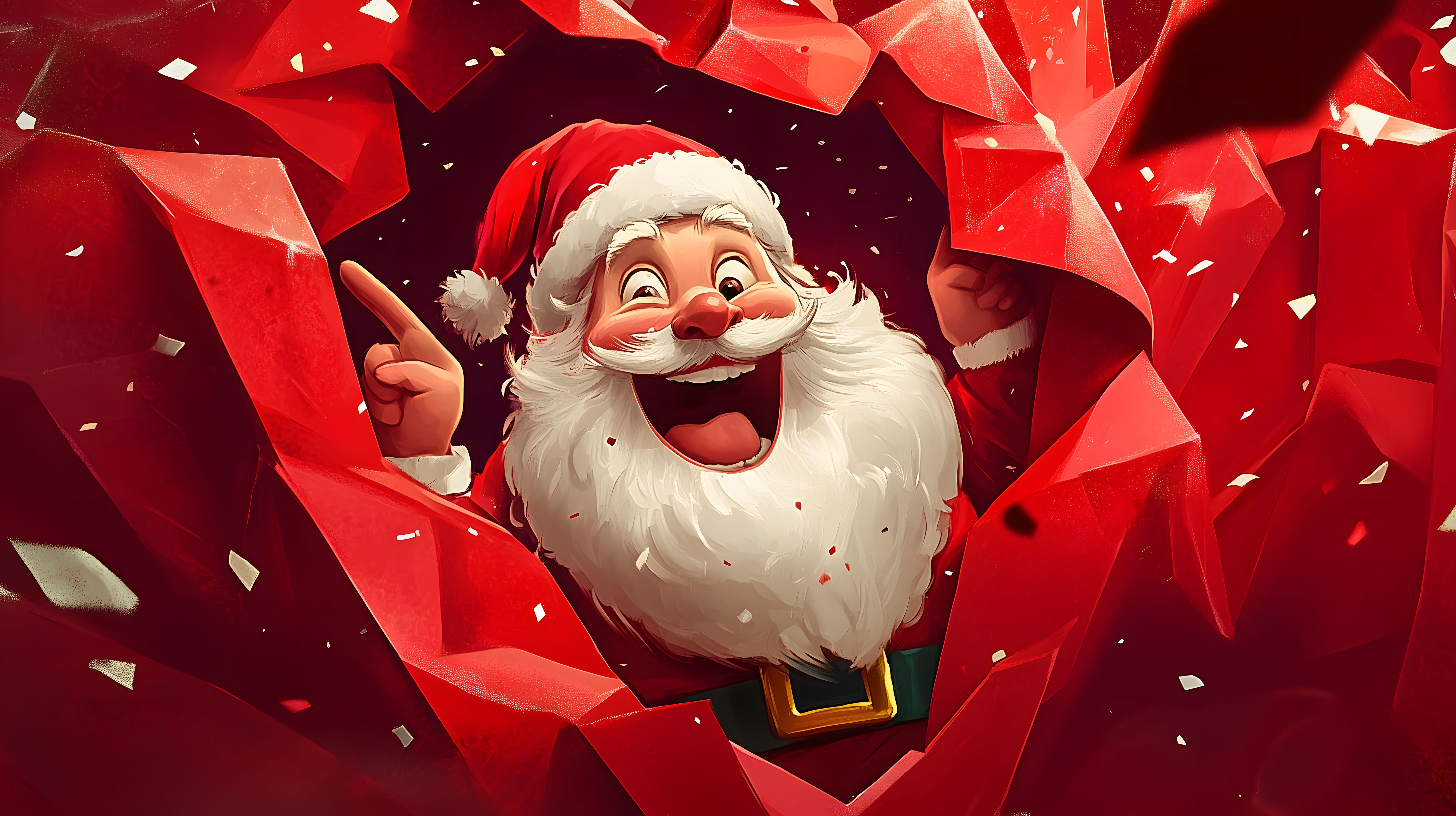 Das Bild zeigt einen fröhlichen und enthusiastischen Weihnachtsmann, der von roten, kristallartigen Formen umgeben ist, die wie Geschenkpapier oder Konfetti aussehen. Der Weihnachtsmann lächelt und gestikuliert aufgeregt, als würde er eine große Überraschung präsentieren. Die Farbpalette ist warm und festlich, mit dominierenden Rot- und Weißtönen, die eine weihnachtliche Stimmung vermitteln.