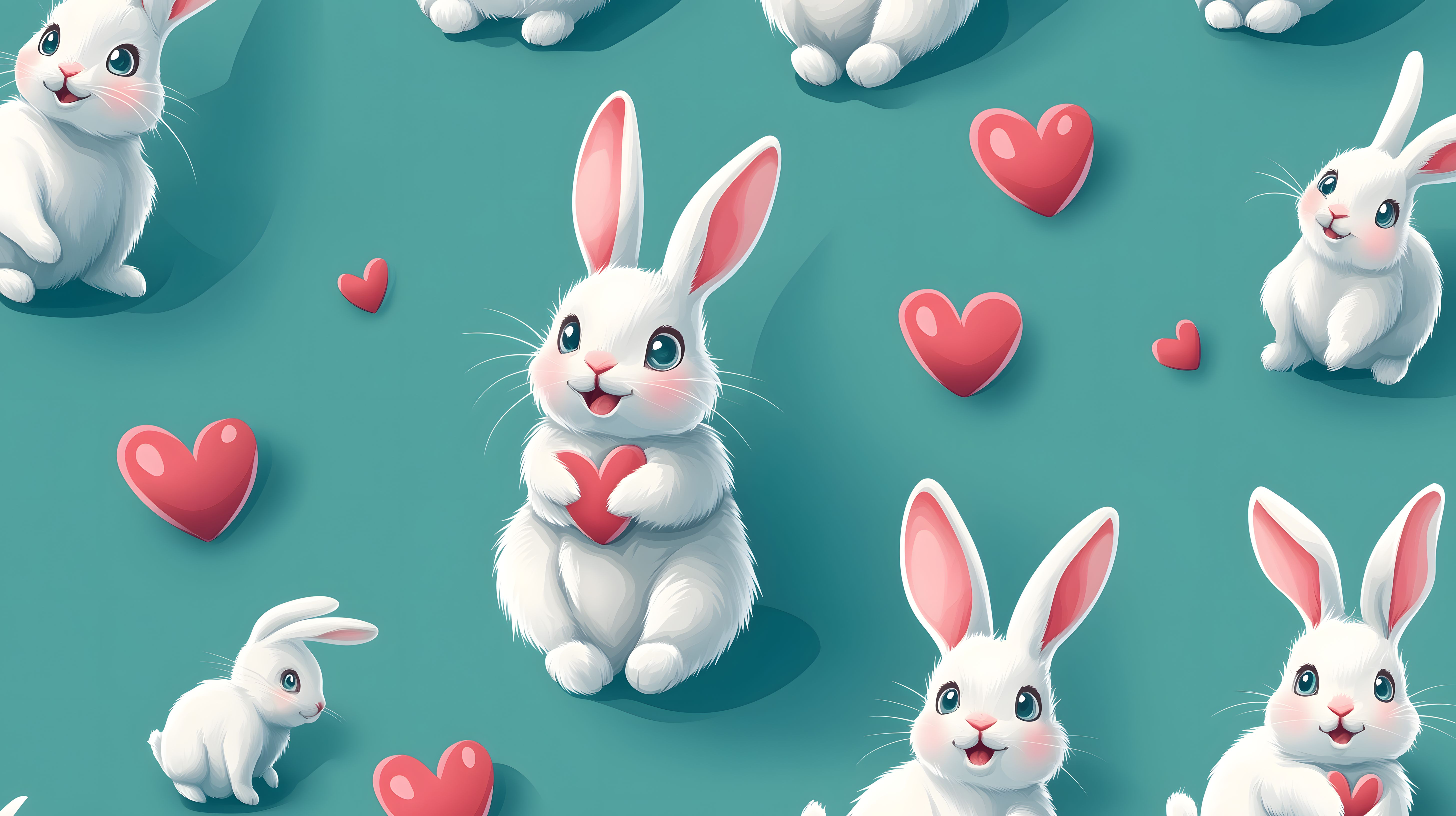 Dieses Stockfoto zeigt eine Illustration von süßen, weißen Cartoon-Kaninchen, umgeben von roten Herzen auf einem türkisfarbenen Hintergrund. Die Kaninchen haben große Augen und lächelnde Gesichter, die Herzen in verschiedenen Größen schweben um sie herum. Die Illustration hat einen freundlichen, romantischen und kindlichen Stil, der sich gut für Frühlings- oder Valentinskarten, Blogbeiträge, Werbung und andere kreative Projekte eignet. Als hochauflösendes, kostenloses Stockfoto unter Creative Commons-Lizenz ist dieses Bild perfekt für die Verwendung in Webseiten, Social-Media-Posts, Flyern und mehr.