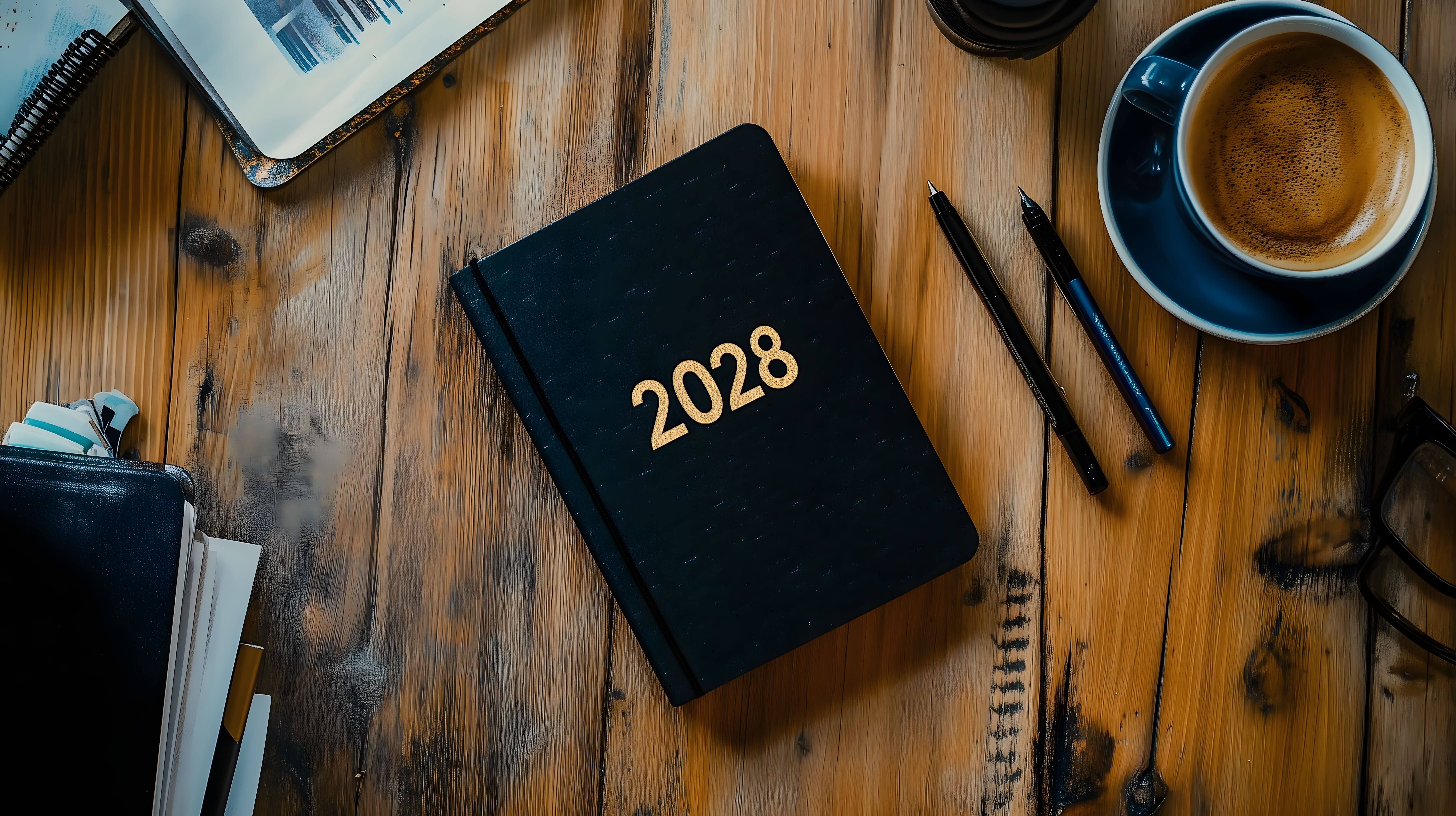 Das Bild zeigt einen Holztisch mit einem schwarzen Notizbuch, auf dem das Jahr 2028 aufgedruckt ist. Daneben stehen eine Tasse Kaffee, ein Bleistift und ein Stift. Im Hintergrund sind weitere Arbeitsmaterialien wie ein Tablet zu sehen. Die Draufsicht-Perspektive und die flache Anordnung der Objekte verleihen dem Bild einen modernen und minimalistischen Stil.