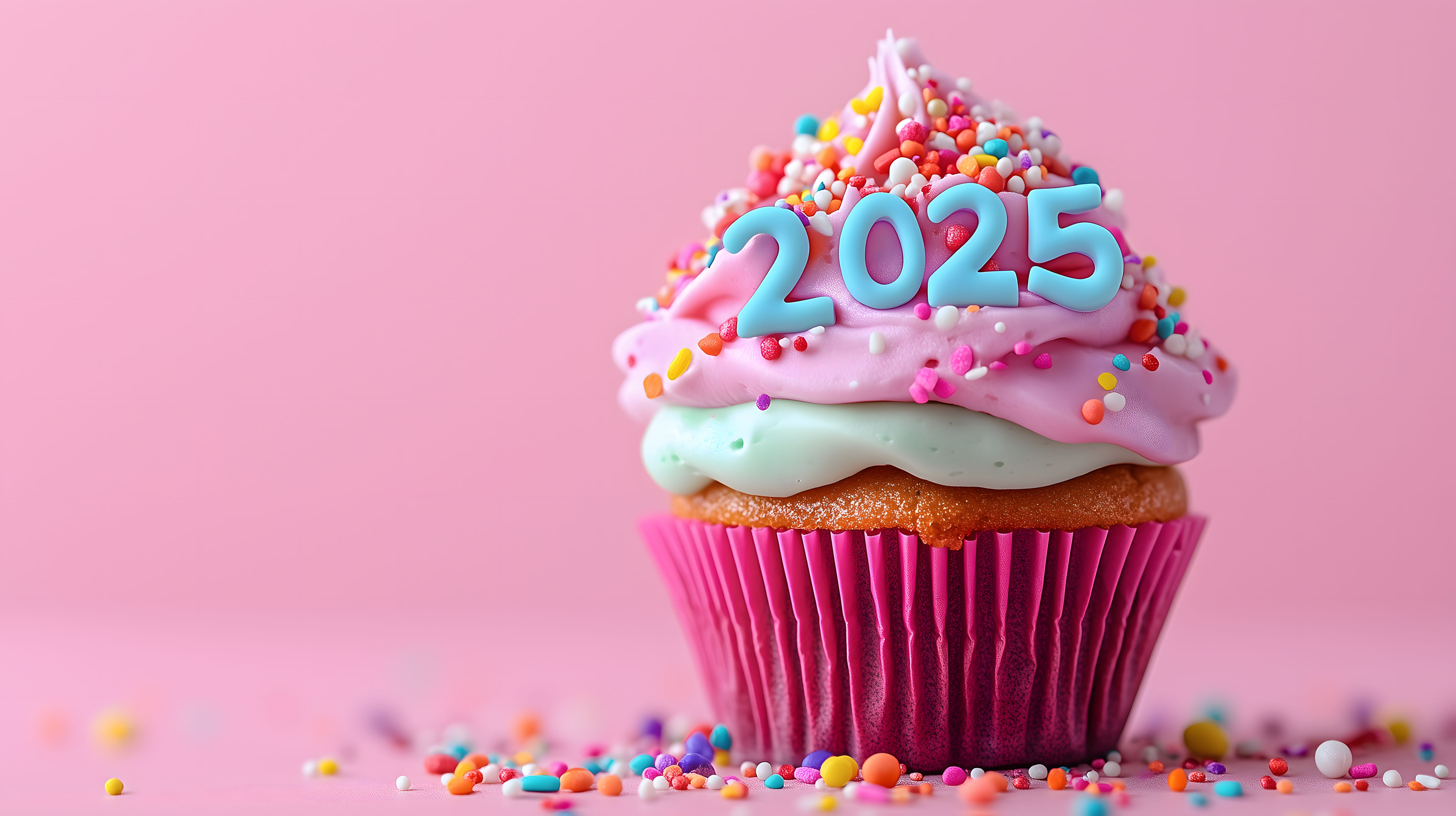 Das Bild zeigt einen dekorativen Geburtstagscupcake mit bunten Zuckerperlen, Streuseln und der Zahl 2025 auf der Spitze. Der Cupcake ist in einem leuchtend rosa Farbton gehalten, der den Blick auf das festliche Dessert in den Mittelpunkt rückt. Die kreative und farbenfrohe Gestaltung des Cupcakes lässt ihn als optischen Hingucker erscheinen und lädt dazu ein, das Gebäck als Teil einer besonderen Feier oder eines Jubiläums zu genießen. Dieses kostenlose Stockfoto in hoher Auflösung eignet sich ideal zur Verwendung in Blogbeiträgen, Newsletter-Layouts oder Social-Media-Postings rund um Themen wie Backen, Feiern und Jubiläen. Die Aufnahme steht unter der Creative-Commons-Lizenz zur freien Nutzung zur Verfügung.