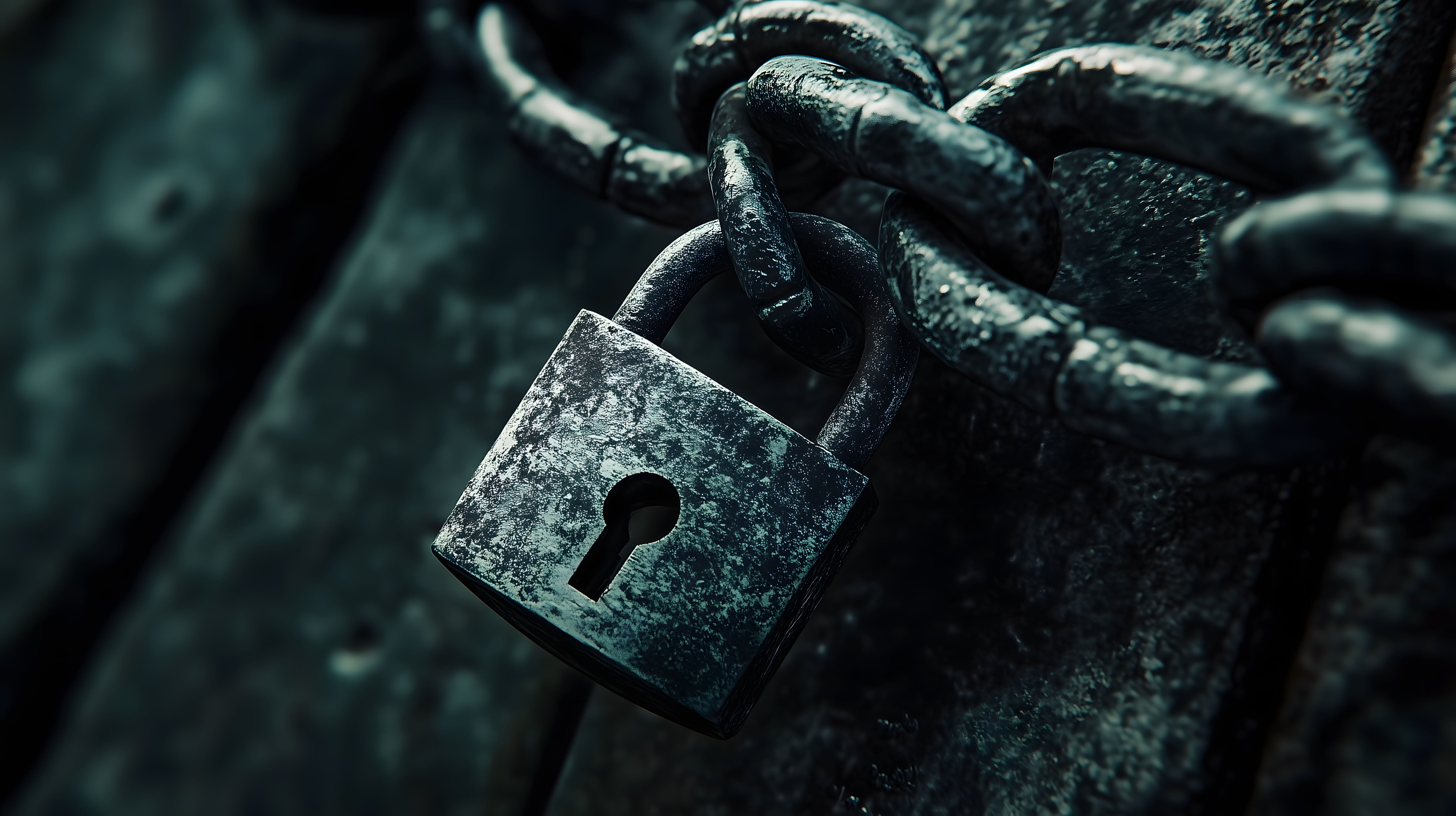 Das Bild zeigt ein altes, rostiges Vorhängeschloss, das an einer Kette hängt. Das Schloss hat eine abgenutzte, dunkle Oberfläche und strahlt eine bedrohliche, industrielle Atmosphäre aus. Die Kette, an der das Schloss befestigt ist, ist ebenfalls dunkel und verleiht dem Motiv eine zusätzliche Dimension der Sicherheit und Verschlossenheit. Dieses Foto eignet sich hervorragend als kostenloses Stockfoto für Blogbeiträge, Newsletter oder Werbekampagnen, die sich mit Themen wie Schutz, Verschluss oder Sicherheit beschäftigen. Es ist in hoher Auflösung verfügbar und steht unter einer Creative-Commons-Lizenz zur Verfügung.