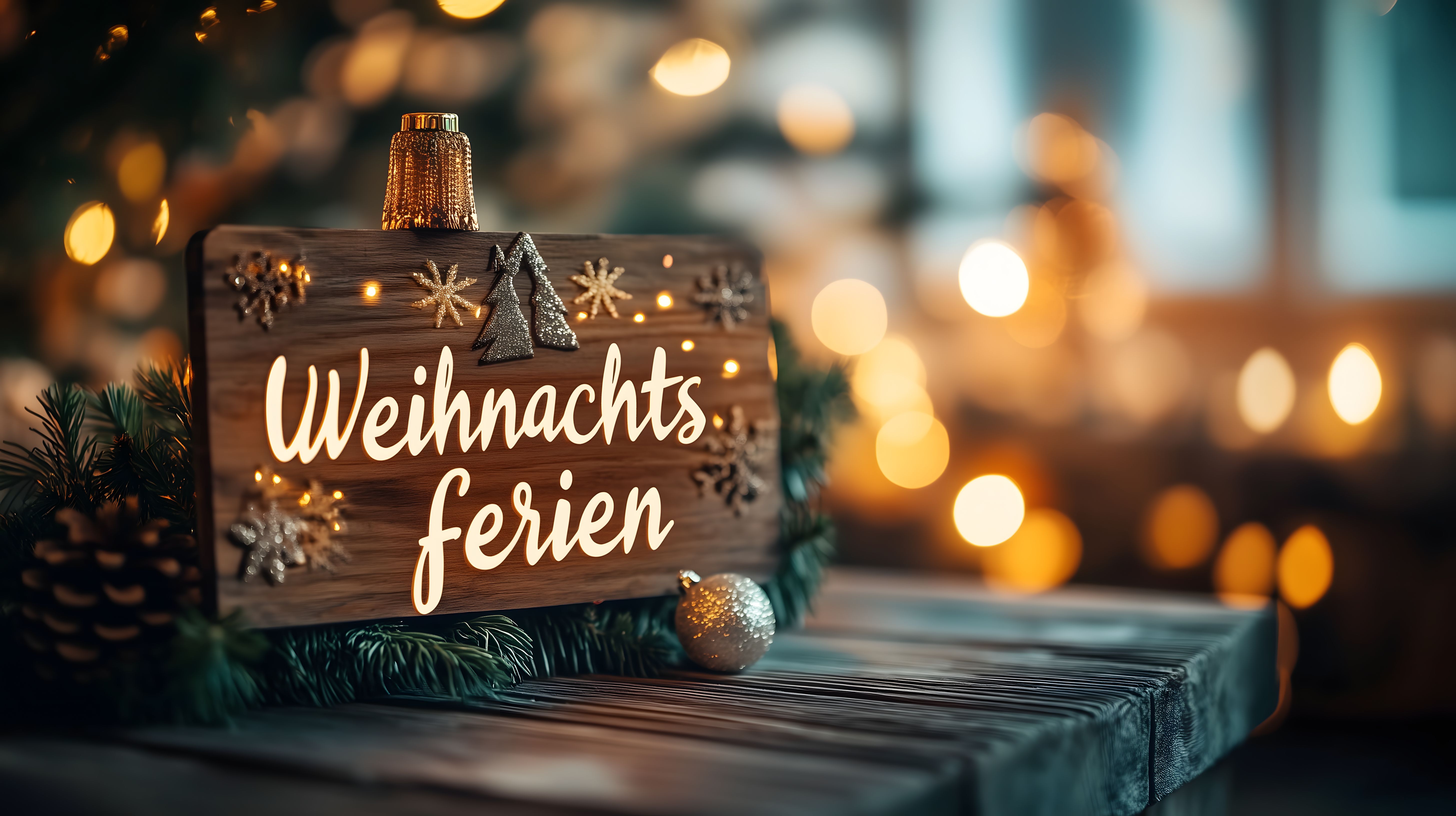 Dieses Foto zeigt ein gemütliches Weihnachtsschild mit der Aufschrift 'Weihnachtsferien' auf einem rustikalen Holztisch. Das Schild ist mit einer Lichterkette und Schneeflocken-Dekorationen verziert, was eine warme, festliche Stimmung erzeugt. Im Hintergrund sieht man verschwommene Lichterketten, die eine schöne Atmosphäre schaffen. Das Foto eignet sich hervorragend als kostenloses Stockfoto für weihnachtliche Designs, Blogs, Newsletter oder Werbung in hoher Auflösung und mit CC-Lizenz.