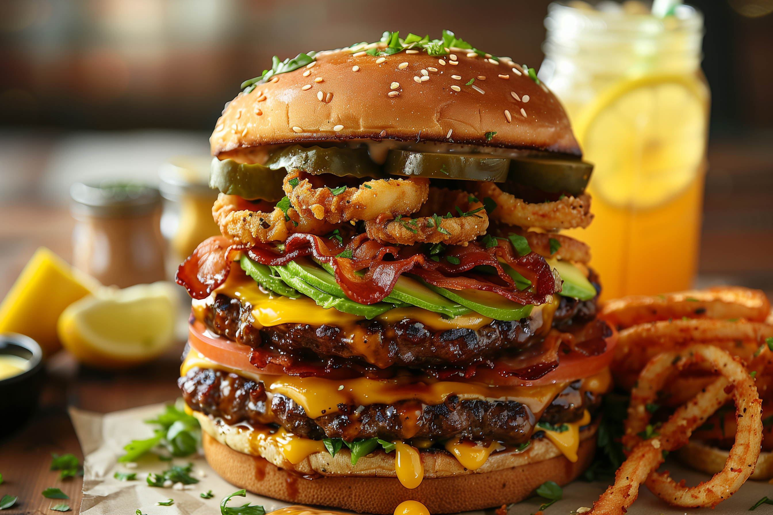 Das Foto zeigt einen üppigen Burger, der vor einem stimmungsvollen Hintergrund platziert ist. Der Burger ist mit verschiedenen Zutaten wie Fleischpatty, Käse, Speck, Salat und Tomaten belegt und wirkt sehr appetitlich. Die Anordnung der Zutaten sowie die Garnierung mit grünen Kräutern verleihen dem Gericht eine gelungene Optik. Der Burger ist auf einem hellen Holzbrett serviert, umgeben von einer Zitronenscheibe und einem Glas mit einer erfrischenden Limonade. Insgesamt vermittelt das Foto ein lebendiges, kulinarisches Ambiente, das sich hervorragend für die Verwendung in Blogs, Newslettern, Social-Media-Kanälen oder Werbematerialien eignen würde. Dieses hochauflösende, kostenlose Stockfoto unter Creative-Commons-Lizenz ist ein attraktiver Blickfang für jede visuelle Präsentation rund um das Thema Gastronomie und Genuss.