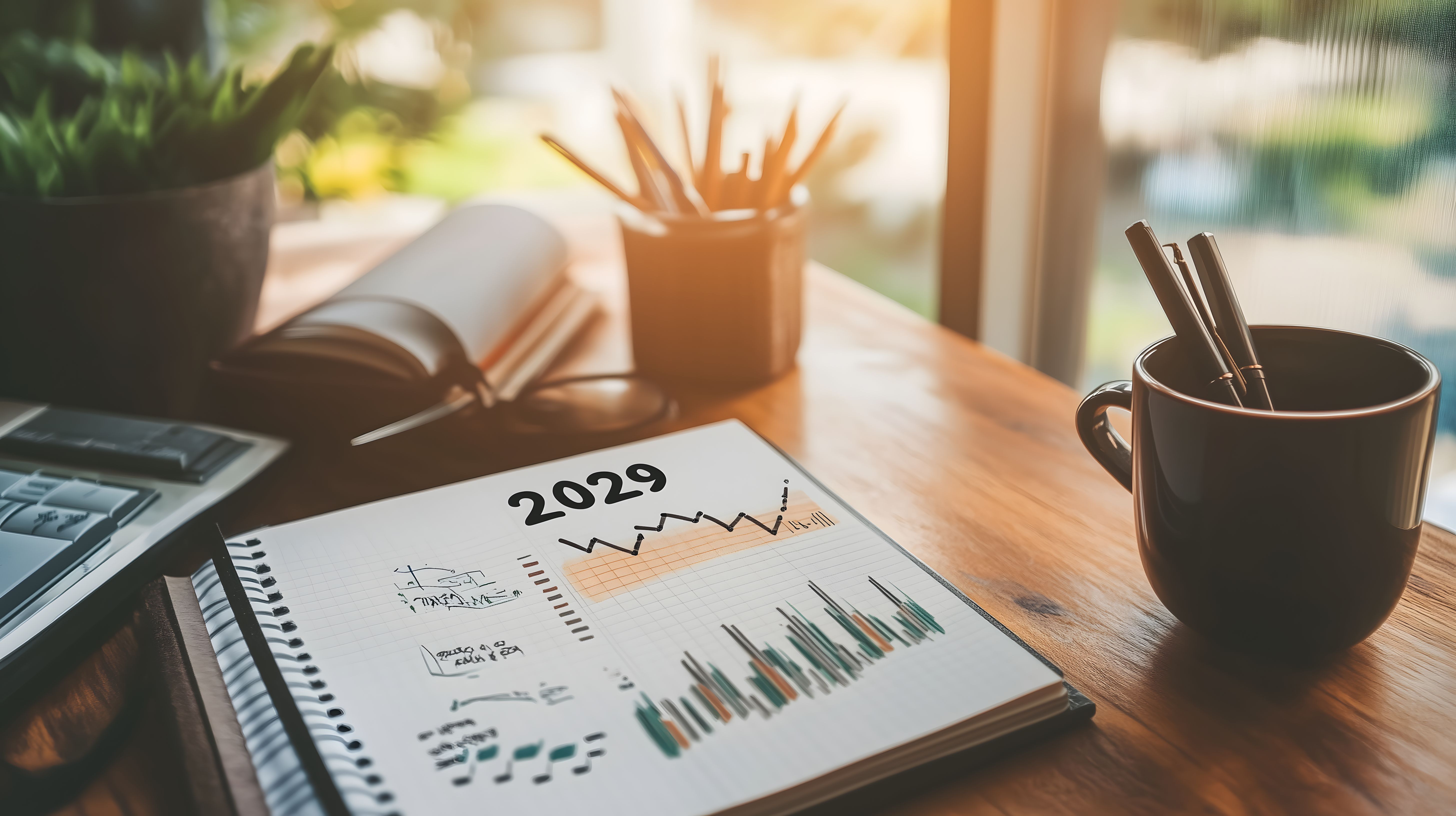 Dieses Bild zeigt einen detaillierten Geschäftsplan für das Jahr 2029 auf einem Notizbuch inmitten eines kreativen Arbeitsplatzes. Der Fokus liegt auf einem Diagramm, das die Ziele und Visionen für das kommende Jahr darstellt. Umgeben von Stiften, einer Tasse und weiteren Büroartikeln vermittelt das Bild einen professionellen und fokussierten Arbeitskontext. Die Fenstergestaltung und das natürliche Licht verleihen dem Arbeitsplatz eine angenehme, inspirierende Atmosphäre. Dieses hochauflösende Stockfoto unter Creative Commons-Lizenz eignet sich hervorragend für Anwendungen in Blogs, Newslettern, Social-Media-Kanälen oder Werbematerial, in denen geschäftliche Planung, Zukunftsvisionen oder Produktivität im Fokus stehen.