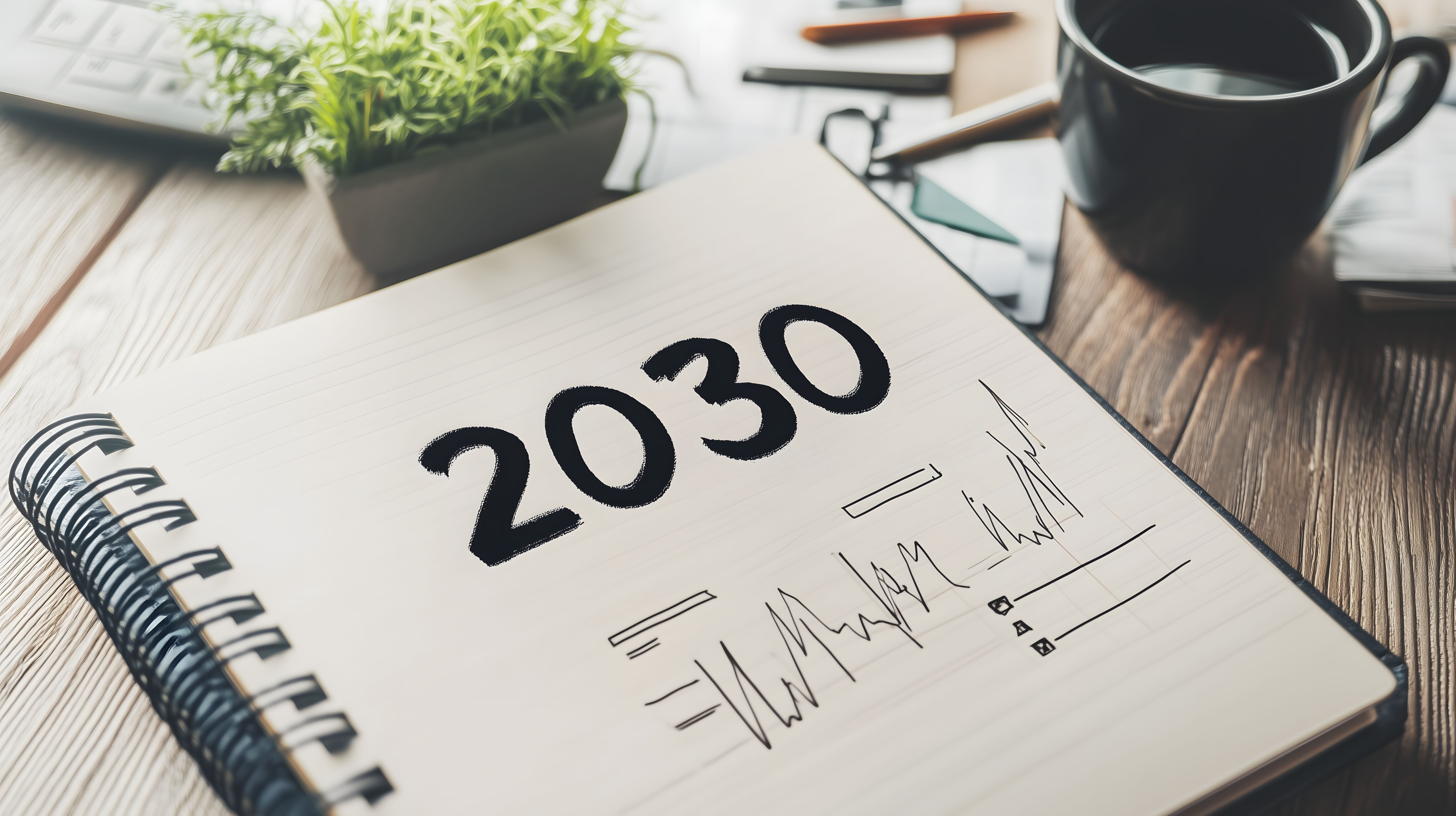 Dieses Stockfoto zeigt einen Schreibtisch mit verschiedenen Objekten, die auf eine Planung für das Jahr 2030 hinweisen. Im Mittelpunkt steht ein Notizbuch mit der Zahl 2030 darauf. Umgeben sind der Notizblock von einer Tasse Kaffee, Stiften und einem kleinen Topf mit Grünpflanzen. Die Anordnung der Elemente auf dem hellen Holztisch vermittelt einen strukturierten und professionellen Arbeitsstil. Dieses Foto eignet sich ideal für Blogbeiträge, Newsletter-Designs oder Social-Media-Posts rund um das Thema Zielsetzung, Strategieplanung und Zukunftsvisionen in Unternehmen oder für Einzelpersonen. Das hochauflösende Stockfoto ist unter einer Creative-Commons-Lizenz verfügbar und kann kostenlos genutzt werden.