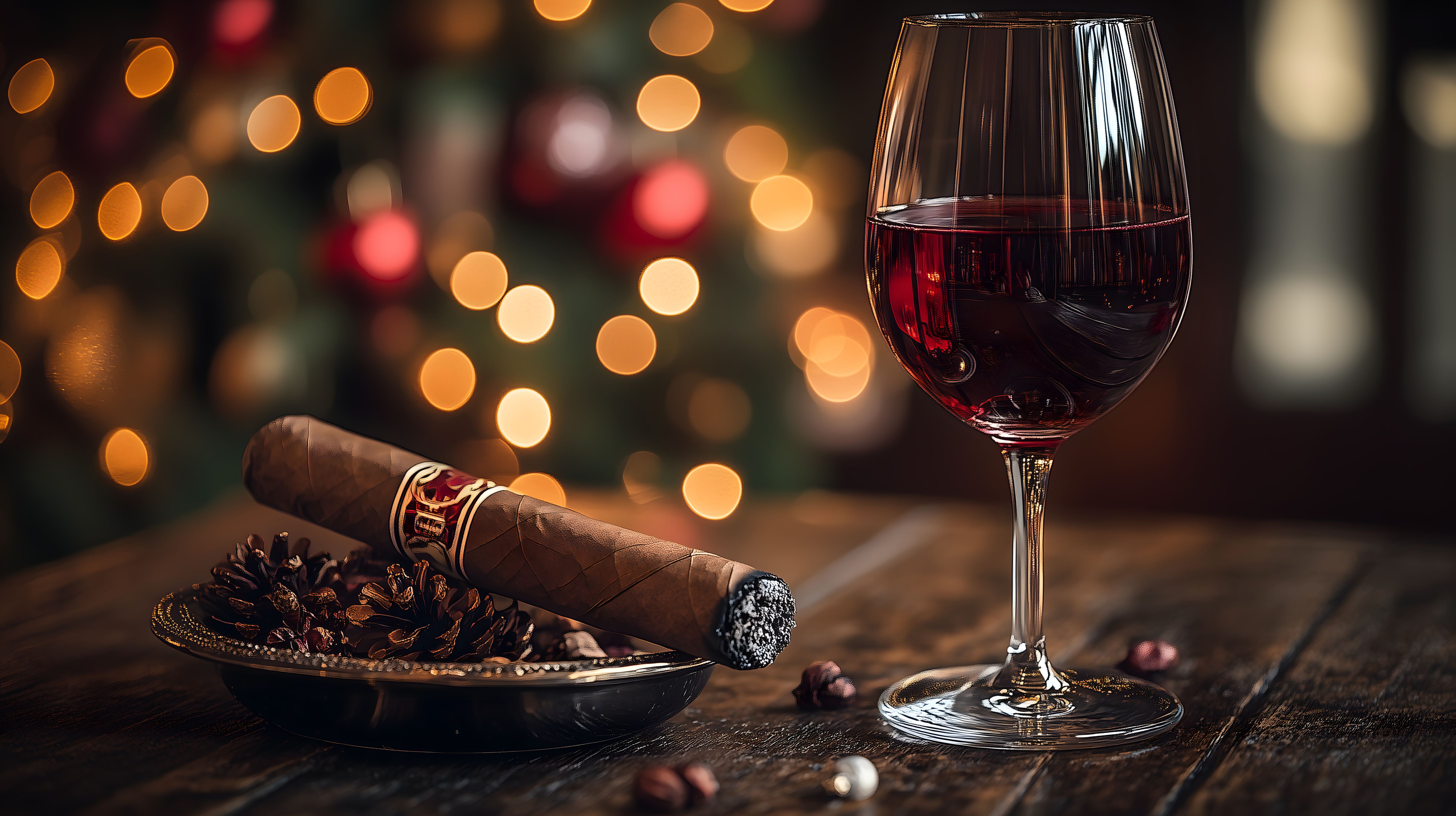 Das Foto zeigt ein stimmungsvolles Arrangement aus einem Glas Rotwein, einer brennenden Zigarre, festlichen Lichterketten und dekorativen Naturmaterialien wie Tannenzapfen und Nüssen. Die warmen, weichen Farbtöne und der Bokeh-Effekt im Hintergrund erzeugen eine romantische, entspannte Atmosphäre. Dieses hochauflösende Stockfoto eignet sich perfekt für die Verwendung in Weihnachts- und Neujahrsdekorationen, Blogs zum Thema Essen und Trinken sowie für festliche Werbekampagnen. Es steht unter einer Creative-Commons-Lizenz zur kostenlosen Nutzung zur Verfügung.