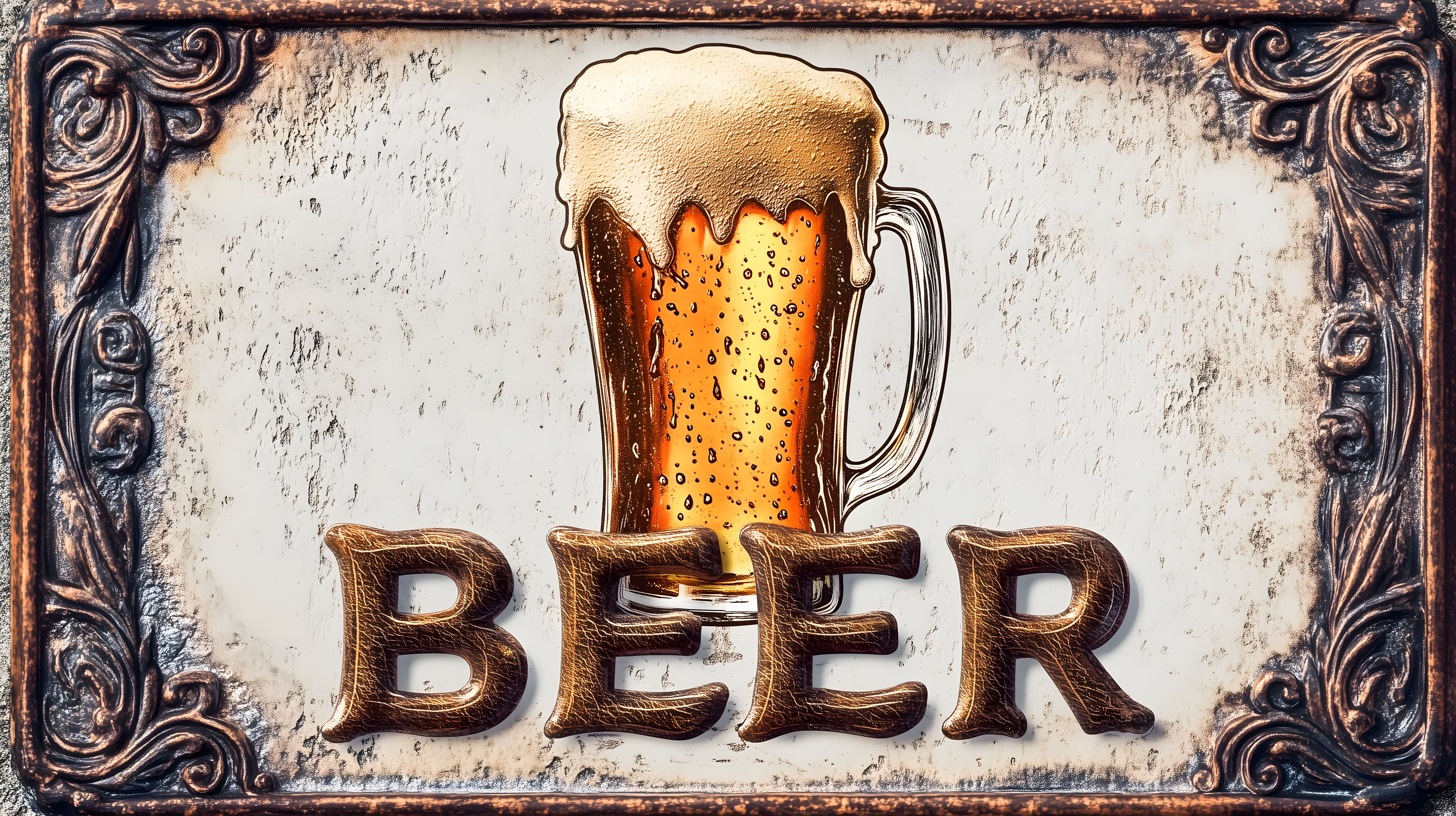 Dieses Foto zeigt ein rustikales, metallisches Werbeschild für Bier. Im Vordergrund ist ein detailliertes Bierglas mit schaumiger Krone zu sehen, umrahmt von ornamentalen Verzierungen. Das Schild vermittelt einen traditionellen, handwerklichen Eindruck und könnte ideal für den Einsatz in Gastronomie, Werbung oder Dekorationszwecken verwendet werden. Dieses hochauflösende, kostenlose Stockfoto unter Creative-Commons-Lizenz ist ideal für Blogs, Newsletter oder Social-Media-Beiträge, in denen ein authentisches, brauereiähnliches Ambiente gewünscht ist.