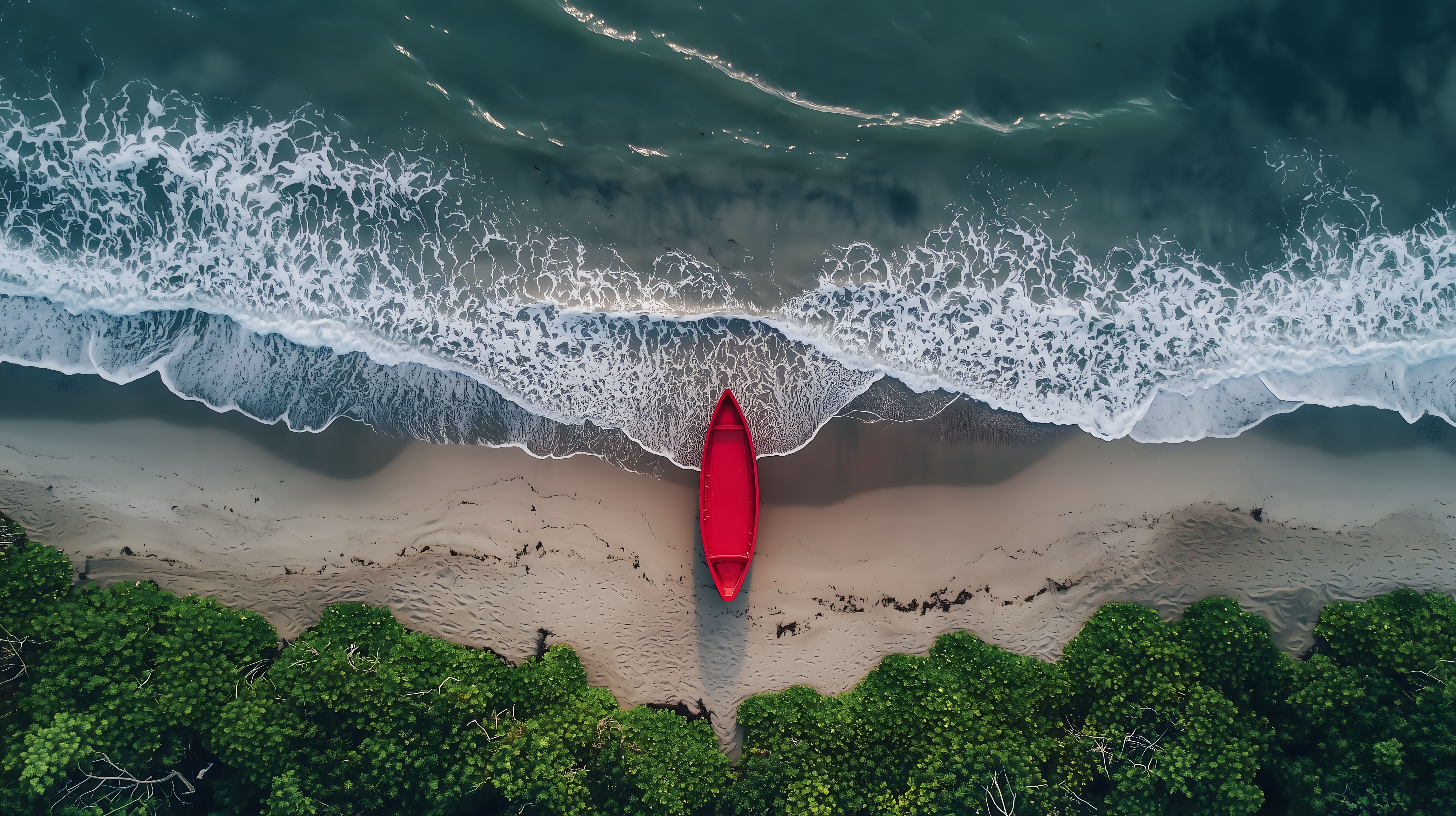 Dieses einzigartige Bild zeigt ein rotes Kanu, das vor einer idyllischen Meereslandschaft treibt. Aus der Vogelperspektive betrachtet, offenbart sich eine faszinierende Szenerie: Die türkisblauen Wellen brechen am Strand, umgeben von üppiger Vegetation. Der Kontrast zwischen dem leuchtend roten Kanu und der natürlichen Umgebung schafft einen visuellen Hingucker, der die Aufmerksamkeit des Betrachters sofort fesselt.