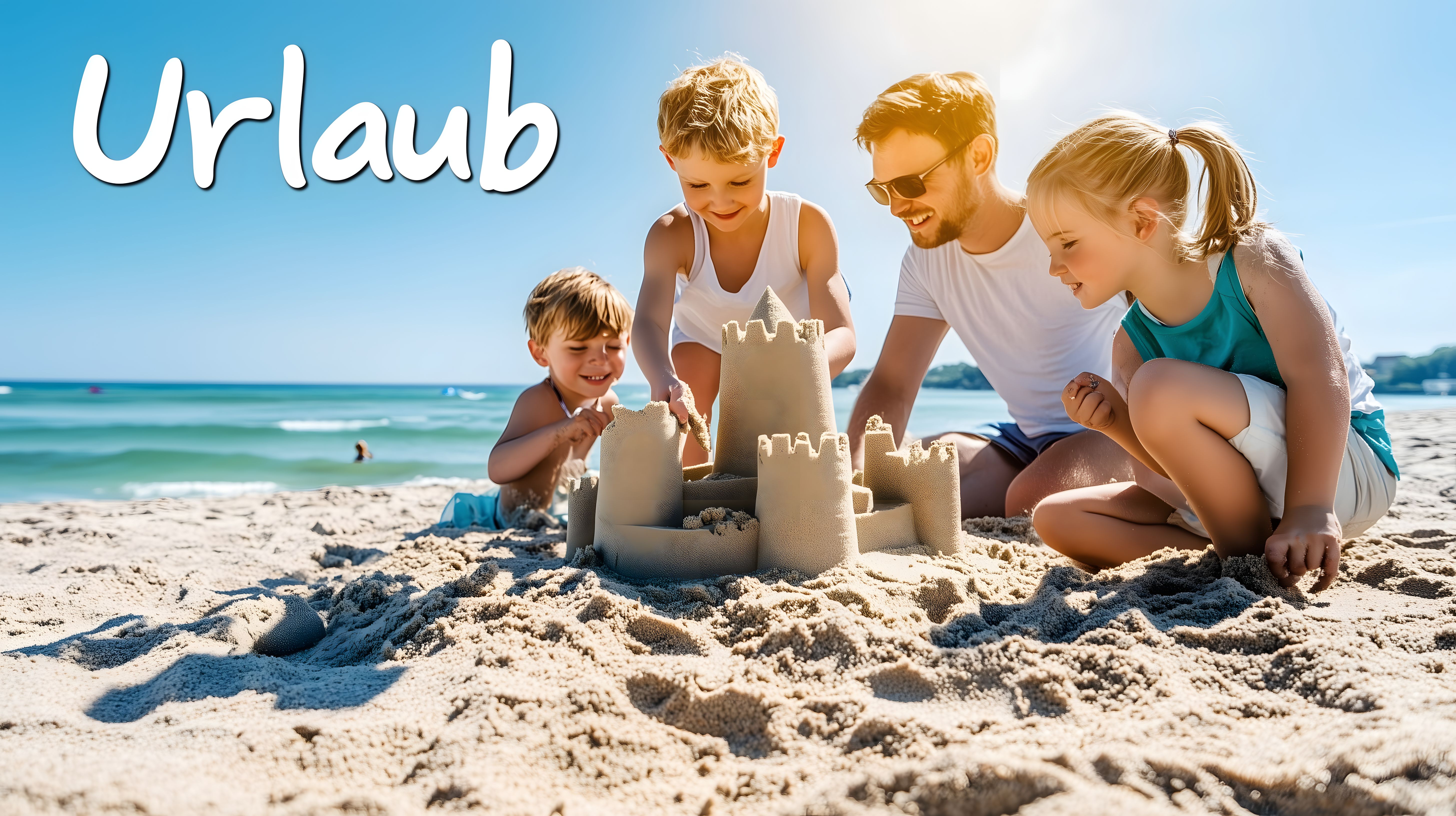 Dieses sonnige Foto zeigt eine glückliche Familie, die am Strand eine Sandburg baut. Die Eltern und ihre beiden Kinder sitzen im weichen Sand und gestalten gemeinsam eine beeindruckende Sandburg. Die Szene strahlt pure Lebensfreude und Entspannung aus. Das Foto eignet sich hervorragend als kostenloses Stock-Foto für Beiträge zum Thema Urlaub, Familie und Sommerzeit. Es ist in hoher Auflösung verfügbar und unter einer Creative-Commons-Lizenz nutzbar.