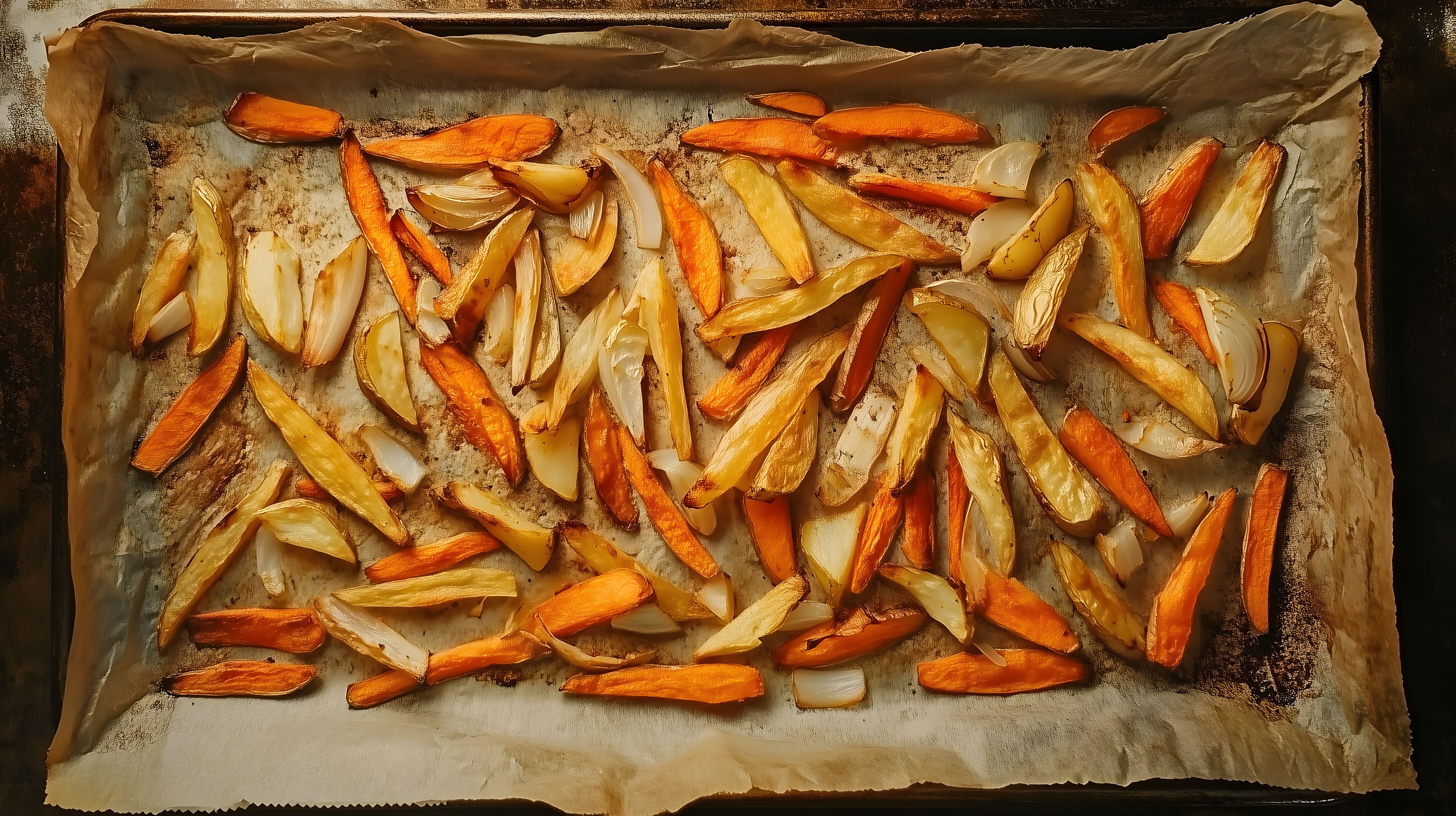 Dieses Foto zeigt eine Draufsicht auf ein Backblech mit knusprig geröstetem Ofengemüse. Die Hauptzutaten sind saftige Karotten und würzige Kartoffelstücke, die auf braunem Backpapier verteilt sind. Die natürlichen Farben, die rustikale Optik und die appetitliche Anordnung der Zutaten machen dieses Bild zu einem idealen Fotomotiv für Rezepte, Foodblogs oder Werbeanzeigen für gesunde Ernährung. Als kostenloses Stockfoto in hoher Auflösung und unter Creative-Commons-Lizenz ist es vielseitig einsetzbar.