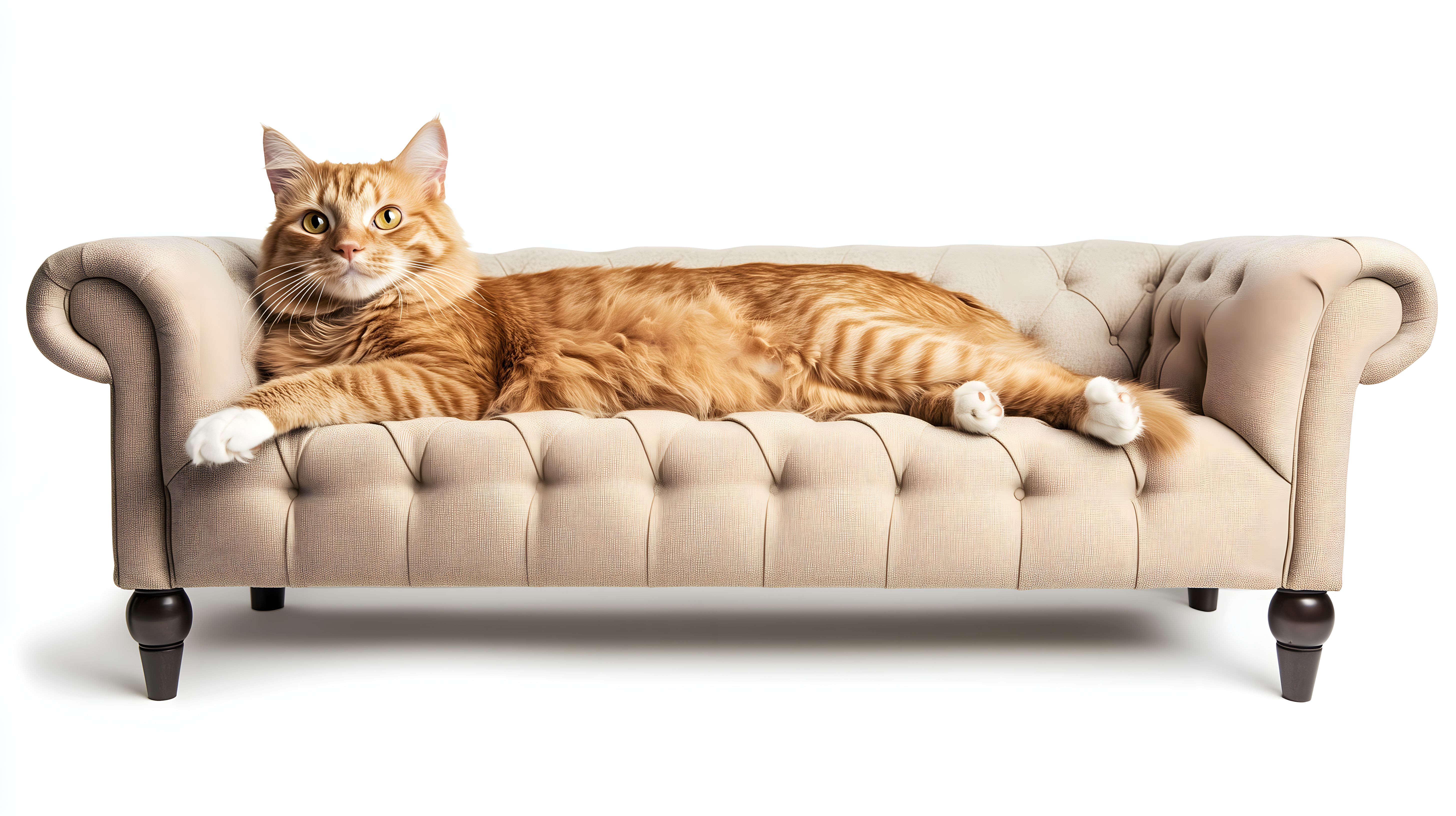 Dieses Foto zeigt eine Katze, die bequem auf einer cremefarbenen Chesterfield-Couch liegt. Die Couch hat einen eleganten, vintage-inspirierten Stil mit Knopfheftungen und dunklen Holzfüßen. Die Katze hat ein weiches, gestreiftes Fell und blickt entspannt in die Kamera. Dieses Foto eignet sich hervorragend für den Einsatz in Blogbeiträgen, Newslettern, Social-Media-Posts oder Werbematerial, die ein gemütliches, stimmungsvolles Ambiente vermitteln möchten. Das Stockfoto ist in hoher Auflösung verfügbar und steht unter einer kostenlosen Creative-Commons-Lizenz zur Verwendung zur Verfügung.