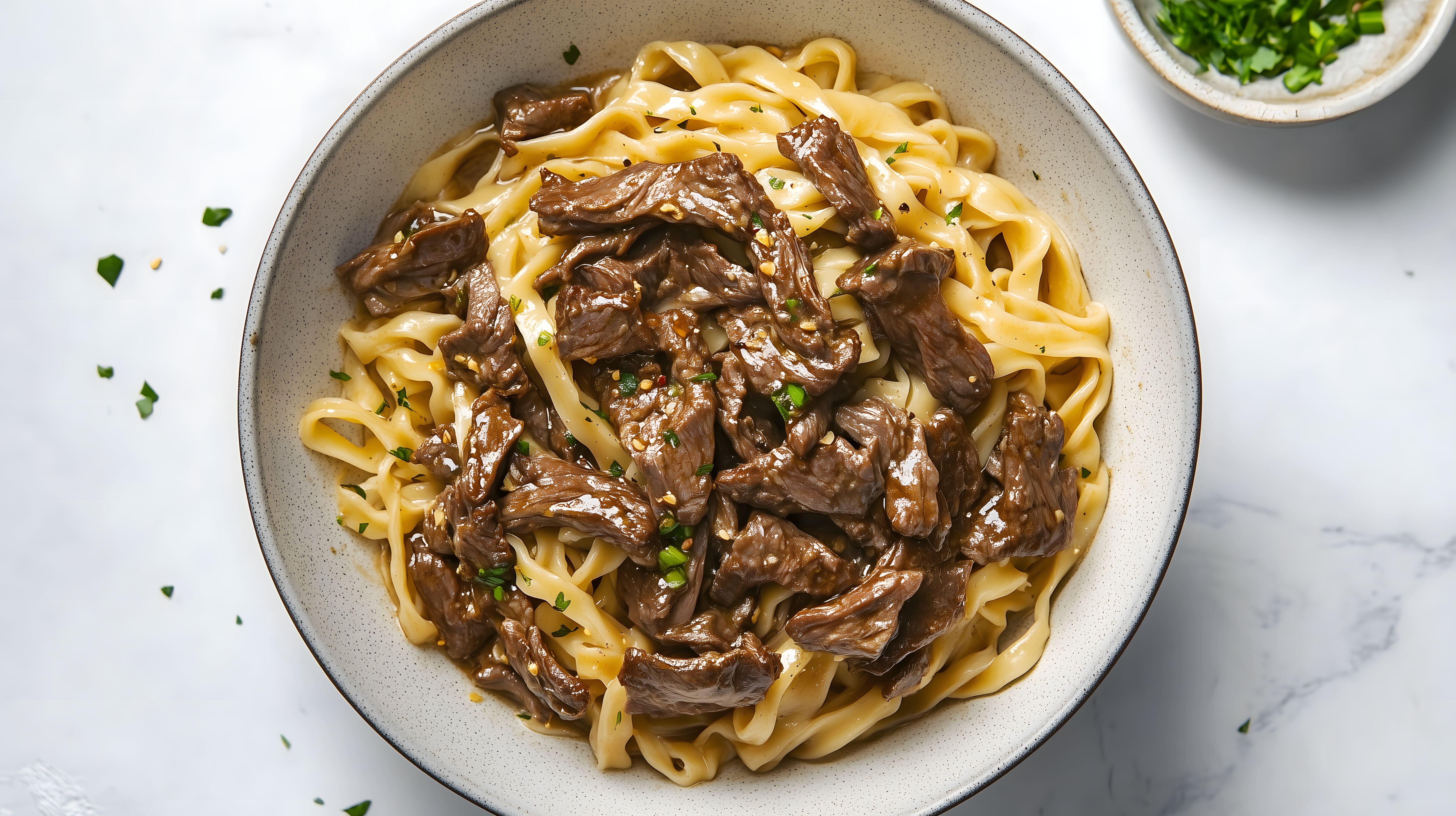 Das Bild zeigt eine leckere Schüssel mit asiatischen Rindfleischnudeln. In der Schüssel befinden sich dicke, goldgelbe Nudeln, die mit zarten Rindfleischstücken und frischen Frühlingszwiebeln garniert sind. Die Sauce hat eine dunkelbraune, sämige Konsistenz und verleiht dem Gericht eine würzige Note. Die Schüssel steht auf einem hellen, marmorartigen Untergrund, was dem Gericht einen rustikalen und gemütlichen Charakter verleiht. Dieses Stockfoto eignet sich perfekt für Rezeptblogs, Kochzeitschriften oder kulinarische Werbematerialien. In hoher Auflösung und unter Creative-Commons-Lizenz kann es kostenfrei genutzt werden.
