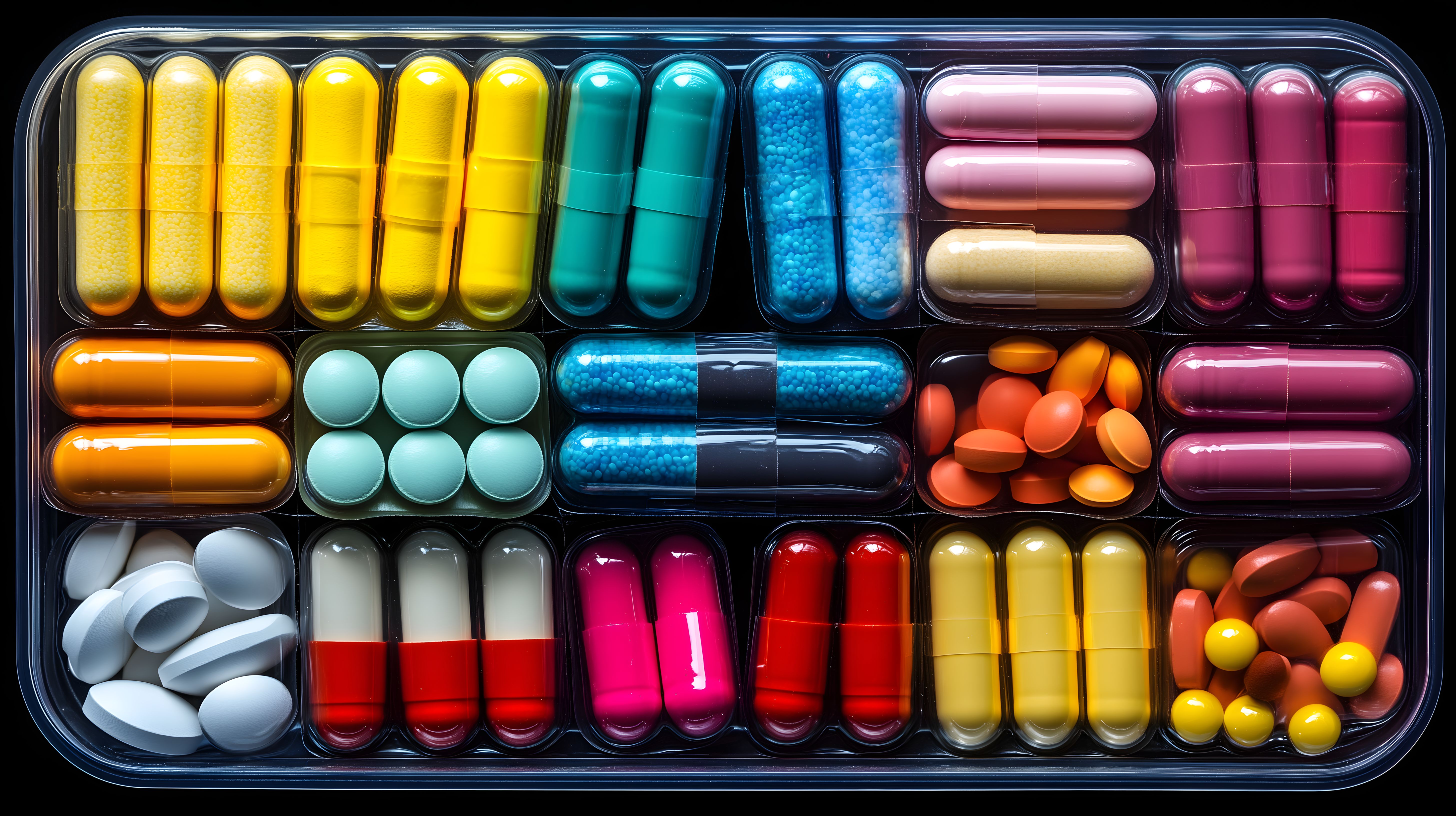 Dieses Foto zeigt eine Nahaufnahme einer Vielzahl an bunten Medikamenten in unterschiedlichen Formen und Farben. Es handelt sich um verschiedene Pillen, Kapseln und Tabletten, die in einem Kunststoffbehälter mit Fächern angeordnet sind. Die Palette reicht von gelb, grün und blau bis hin zu rosa, rot und orange Tönen, was eine hohe Farbvielfalt ergibt. Dieses Stockfoto eignet sich hervorragend für den Einsatz in Artikeln, Blogs oder Werbematerialien rund um das Thema Gesundheit, Medizin, Pharmazie oder Wellness. Es ist in hoher Auflösung und unter einer Creative-Commons-Lizenz verfügbar, sodass es kostenfrei für verschiedene Zwecke genutzt werden kann.