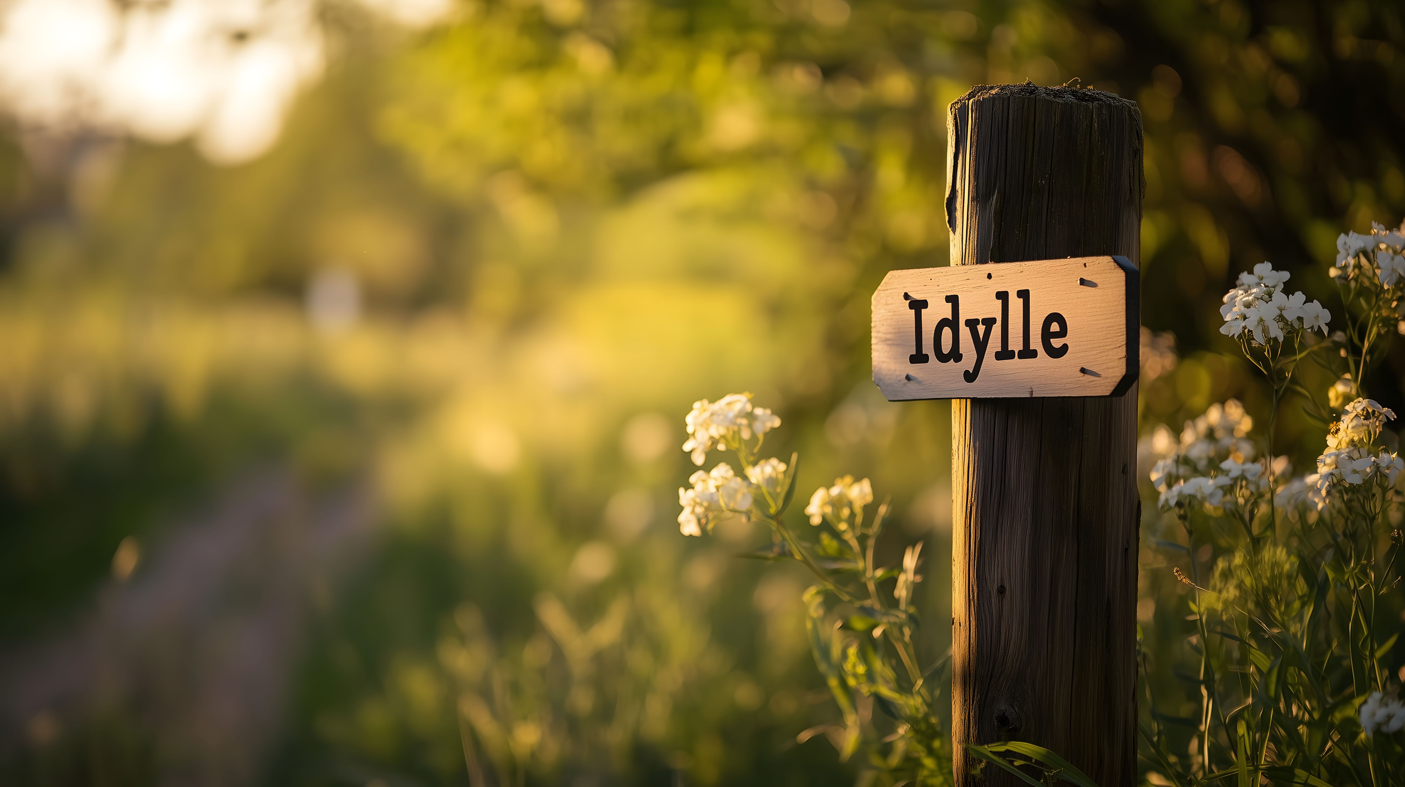 Dieses malerische Foto zeigt ein Holzschild mit der Aufschrift 'Idylle' inmitten einer natürlichen, waldigen Szenerie. Die warmen, goldenen Sonnenstrahlen durchdringen die üppige Vegetation, schaffen einen stimmungsvollen Lichteinfall und verleihen der Szene eine friedliche, entspannende Atmosphäre. Das Schild, einfach und schlicht gestaltet, lenkt den Blick auf die umgebende Natur und lässt die Betrachter in eine idyllische Welt eintauchen. Dieses Stockfoto in hoher Auflösung eignet sich hervorragend als Hintergrundbild für Blogbeiträge, Social-Media-Kanäle, Werbematerial oder andere visuelle Projekte, bei denen eine natürliche, ruhige und erholsame Optik gefragt ist. Es ist unter der Creative-Commons-Lizenz frei nutzbar.