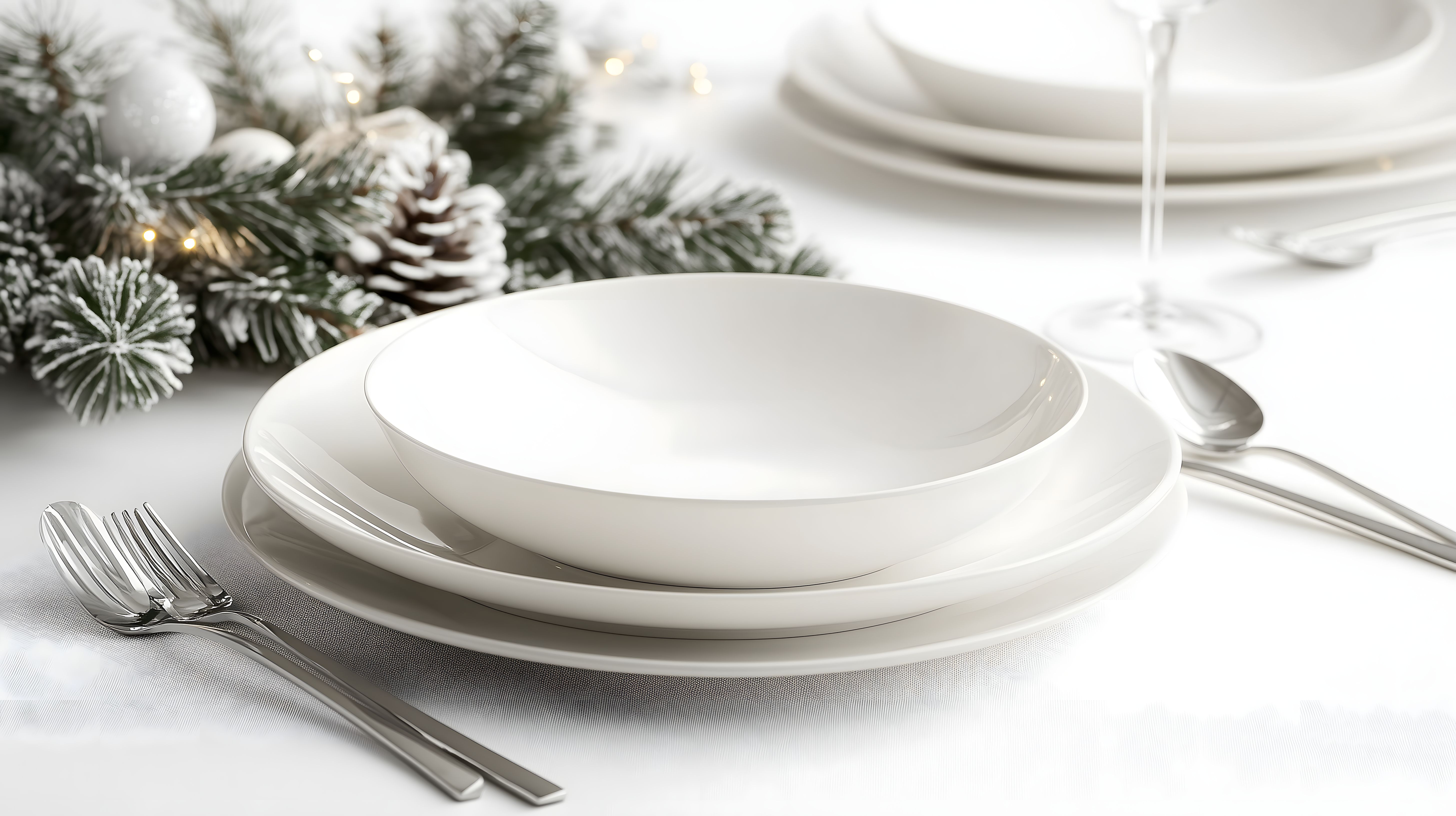 Dieses Bild zeigt einen festlich gedeckten Weihnachtstisch mit schneebedeckten Tannenzweigen als stimmungsvolle Deko. Das Geschirr, Besteck und Gläser sind in einem schlichten, eleganten Weiß gehalten, das den Blick auf die winterliche Pracht lenkt. Die Komposition wirkt ausgewogen und lädt zum gemütlichen Verweilen ein. Dieses hochauflösende Stockfoto eignet sich hervorragend für den Einsatz in Werbung, Blogbeiträgen oder sozialen Medien rund um Weihnachten, Gastronomie und Eventplanung. Es steht unter einer Creative-Commons-Lizenz kostenlos zum Download zur Verfügung.