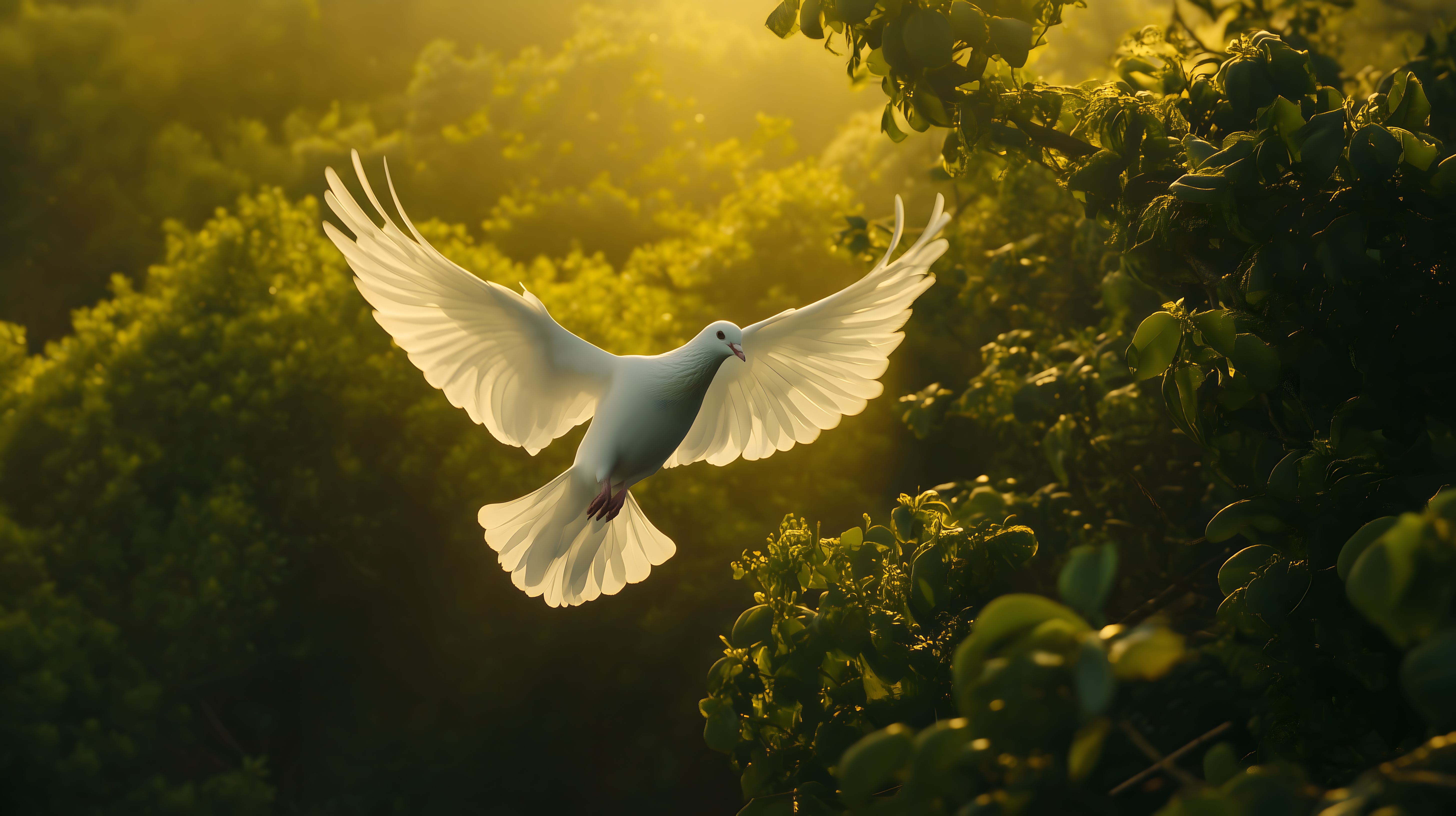 Dieses eindrucksvolle Foto zeigt eine majestätisch fliegende weiße Taube vor einer wunderschönen, sonnendurchfluteten Naturkulisse. Der Vogel schwebt mit ausgebreiteten Flügeln in einem zarten, goldfarbenen Licht, das die üppige, grüne Vegetation rund um ihn herum in warme Töne taucht. Das Bild vermittelt eine Stimmung von Freiheit, Leichtigkeit und Frieden. Es eignet sich hervorragend als kostenloses Stockfoto für die Verwendung in Blogs, Newslettern, Social-Media-Beiträgen oder für Werbedesigns. Die hohe Auflösung und die Creative-Commons-Lizenz ermöglichen eine flexible Nutzung für verschiedenste Zwecke.