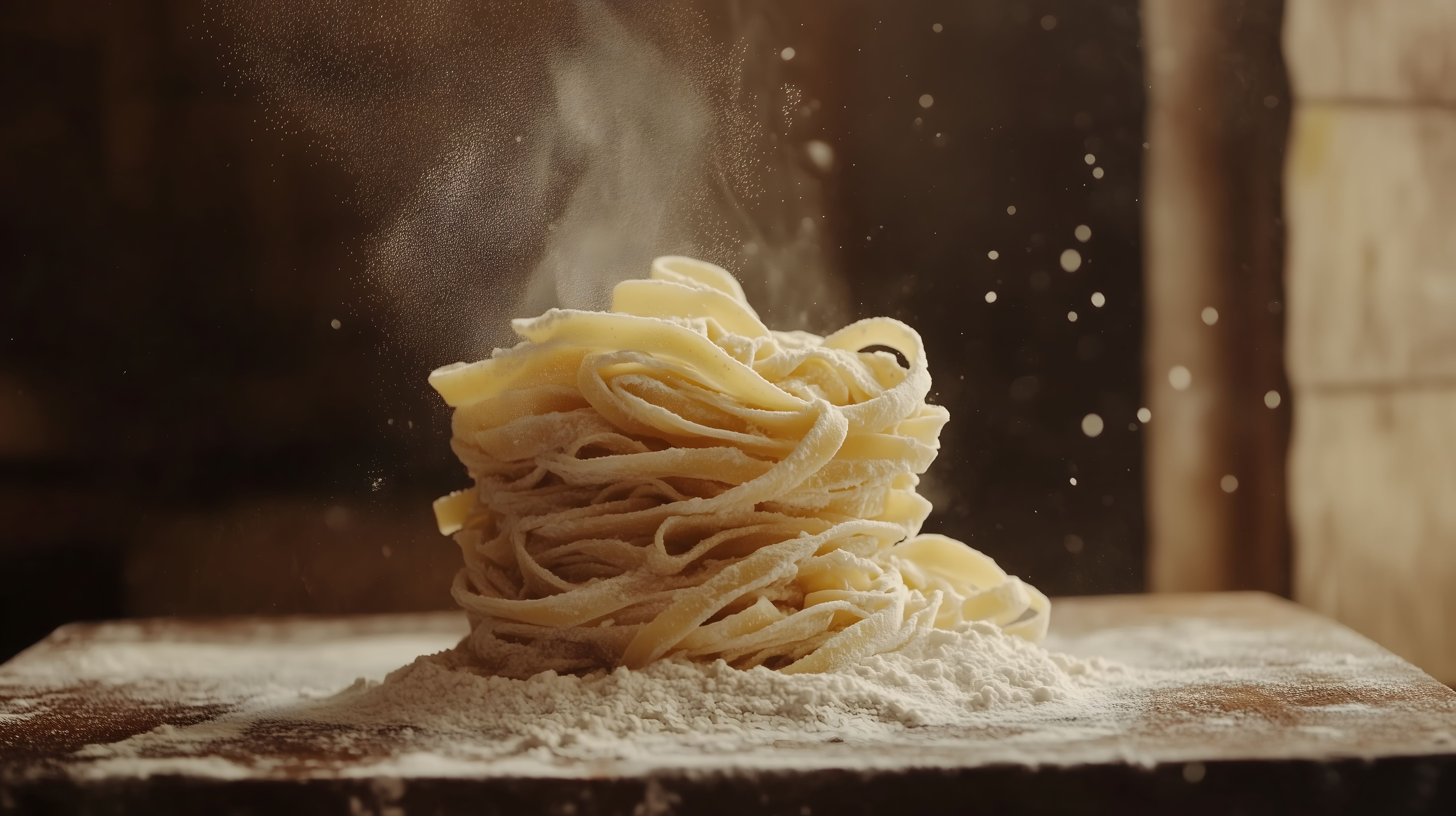 Das Bild zeigt frische, selbstgemachte Fettuccini-Nudeln, die auf einem Holzbrett mit feinem Mehlstaub bedeckt sind. Die Nudeln sind in einer detailreichen, rustikalen Optik dargestellt, was sie ideal als Hintergrundbild für Werbung, Blogs oder soziale Medien eignen lässt. Dieses hochauflösende Stockfoto steht unter einer Creative-Commons-Lizenz zur freien Verwendung zur Verfügung.