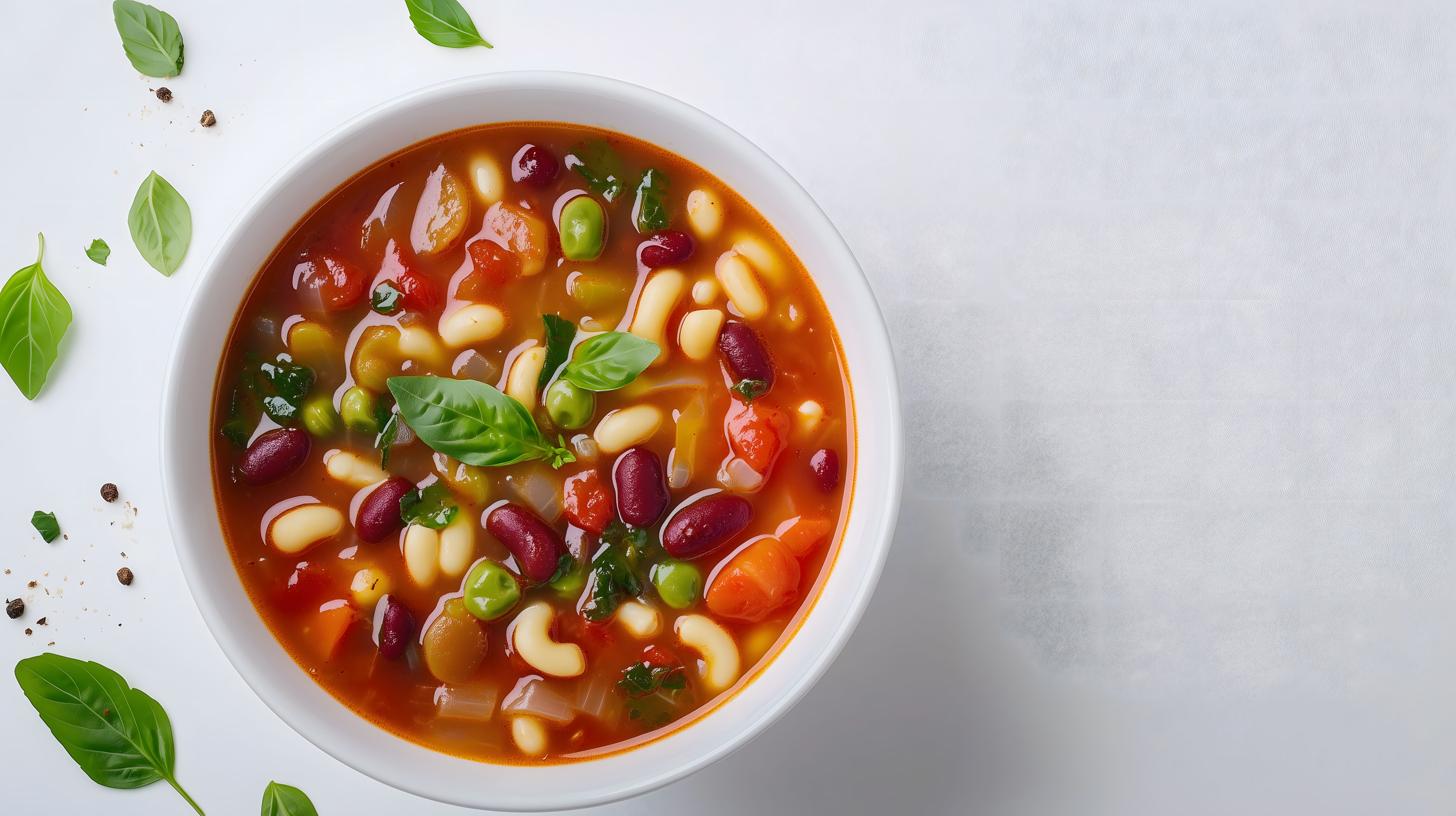 Diese Nahaufnahme zeigt eine Schüssel voller leckerer Gemüsesuppe. Die Suppe ist eine klassische Minestrone und enthält viele frische Zutaten wie Tomaten, Paprika, Mais, Bohnen und Basilikum. Die Suppe hat eine kräftige rote Farbe und eine appetitliche Konsistenz. Sie wird vor einem weißen Hintergrund präsentiert, der den Fokus ganz auf das Gericht lenkt. Diese hochwertige Stockfoto-Aufnahme eignet sich hervorragend für den Einsatz in Rezeptblog-Beiträgen, Kochbüchern, Newsletter-Layouts oder Werbematerialien für gesunde Ernährung. Das Foto ist in hoher Auflösung verfügbar und kann unter der Creative-Commons-Lizenz kostenfrei genutzt werden.