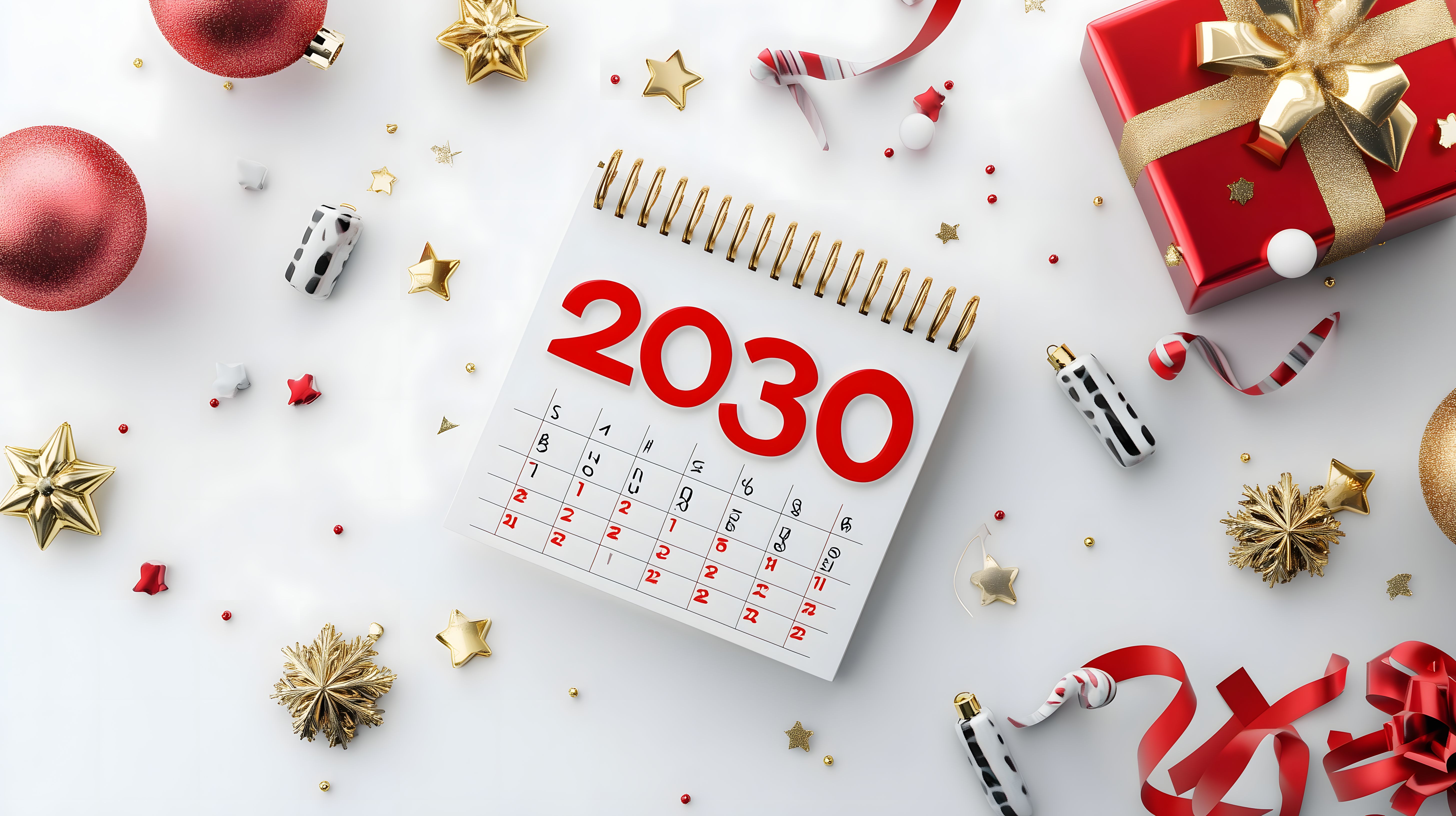 Dieses hochauflösende Stockfoto zeigt einen Weihnachtskalender für das Jahr 2030 umgeben von festlicher Dekoration. Die Seiten des Kalenders sind mit roten Zahlen bedruckt, die den Monat Januar des Jahres 2030 darstellen. Rund um den Kalender befinden sich glänzende rote Weihnachtskugeln, goldene Sterne, rot-weiße Geschenkverpackungen mit Schleifen, Konfetti und weitere weihnachtliche Elemente. Die Farbgebung in Rot, Gold und Weiß verleiht dem Bild einen stimmungsvollen, feierlichen Charakter. Dieses kostenlose Stockfoto eignet sich hervorragend für Weihnachts- und Neujahrsgestaltungen in Blogs, Newslettern, Social-Media-Posts oder Werbematerialien.