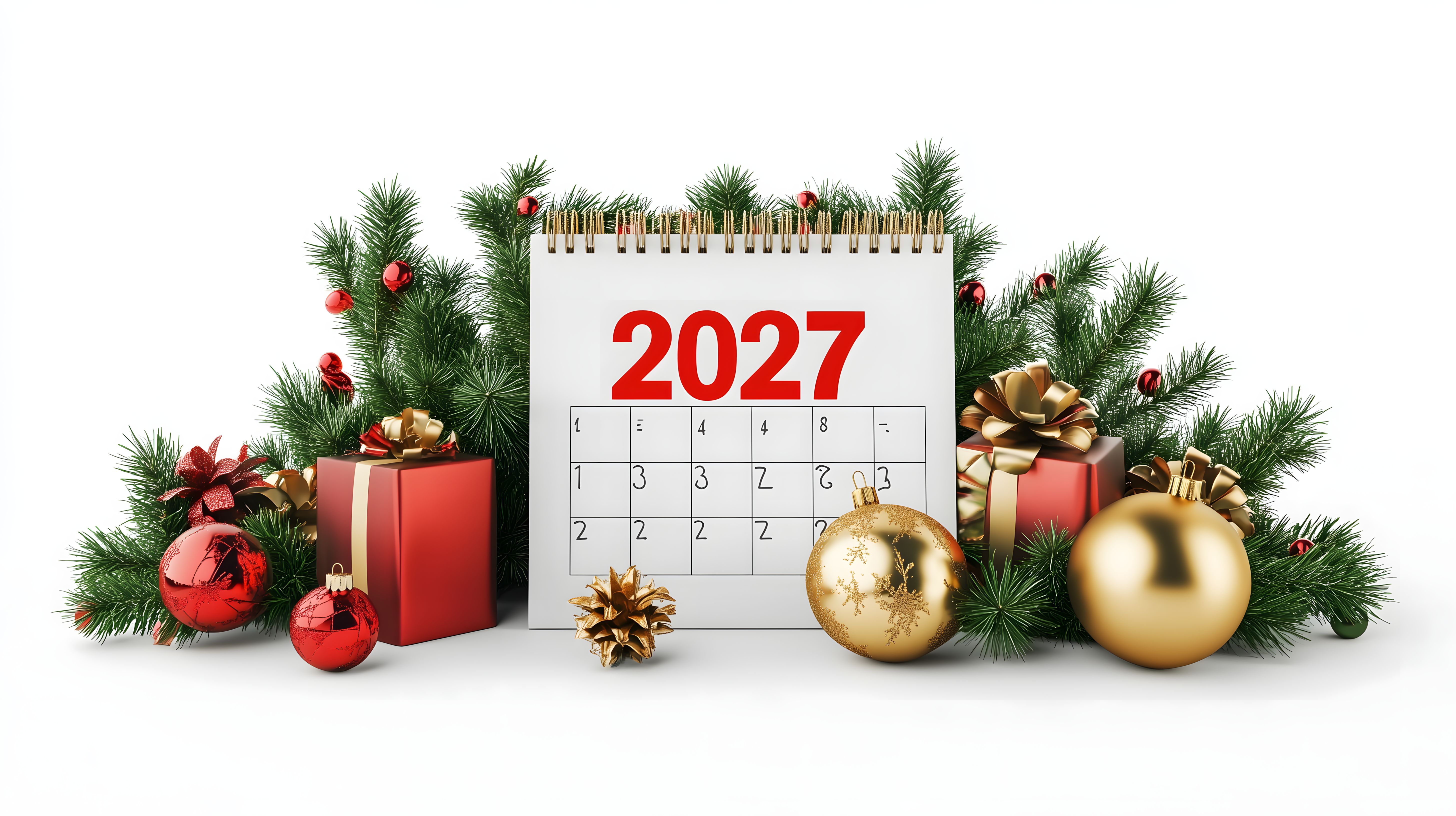 Dieses festliche Weihnachtsfoto zeigt einen Kalender für das Jahr 2027 umgeben von typischen Weihnachtsdekorationen wie Tannenzweigen, Christbaumkugeln in Rot und Gold sowie Geschenkboxen mit Schleifen. Die klare, aufgeräumte Komposition und der hochwertige, hochauflösende Bildinhalt machen das Foto perfekt für den Einsatz in Weihnachts-Blogs, Newsletter-Designs, Social-Media-Beiträgen oder Werbematerialien. Als hochwertiges Stockfoto in hoher Auflösung und unter einer Creative-Commons-Lizenz ist es kostenfrei für private und kommerzielle Zwecke nutzbar.