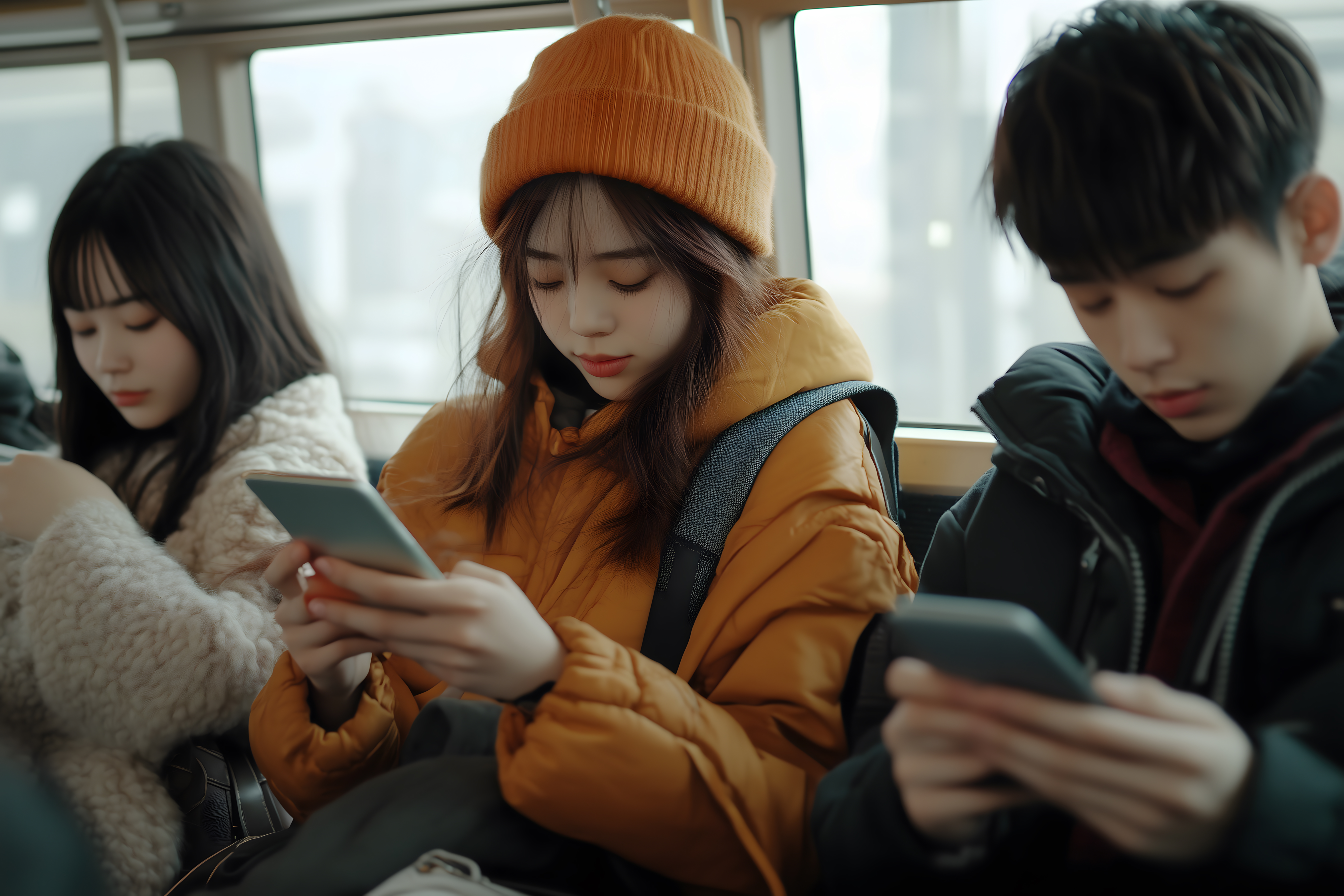 Das Foto zeigt drei junge Menschen, vermutlich Jugendliche oder Teenager, die in einem Zug sitzen und auf ihre Smartphones blicken. Sie sind mit warmer Winterkleidung bekleidet und scheinen in ihre digitalen Geräte vertieft zu sein. Das Bild vermittelt einen Eindruck von der alltäglichen Nutzung von Smartphones in öffentlichen Verkehrsmitteln und dem modernen, urbanen Lebensstil junger Menschen. Das Foto könnte sich gut für den Einsatz in Blogs, Social-Media-Beiträgen oder Werbekampagnen zum Thema digitale Kommunikation, jugendliche Zielgruppen oder Mobilität eignen. Es handelt sich um ein hochwertiges, kostenloses Stockfoto unter Creative-Commons-Lizenz.
