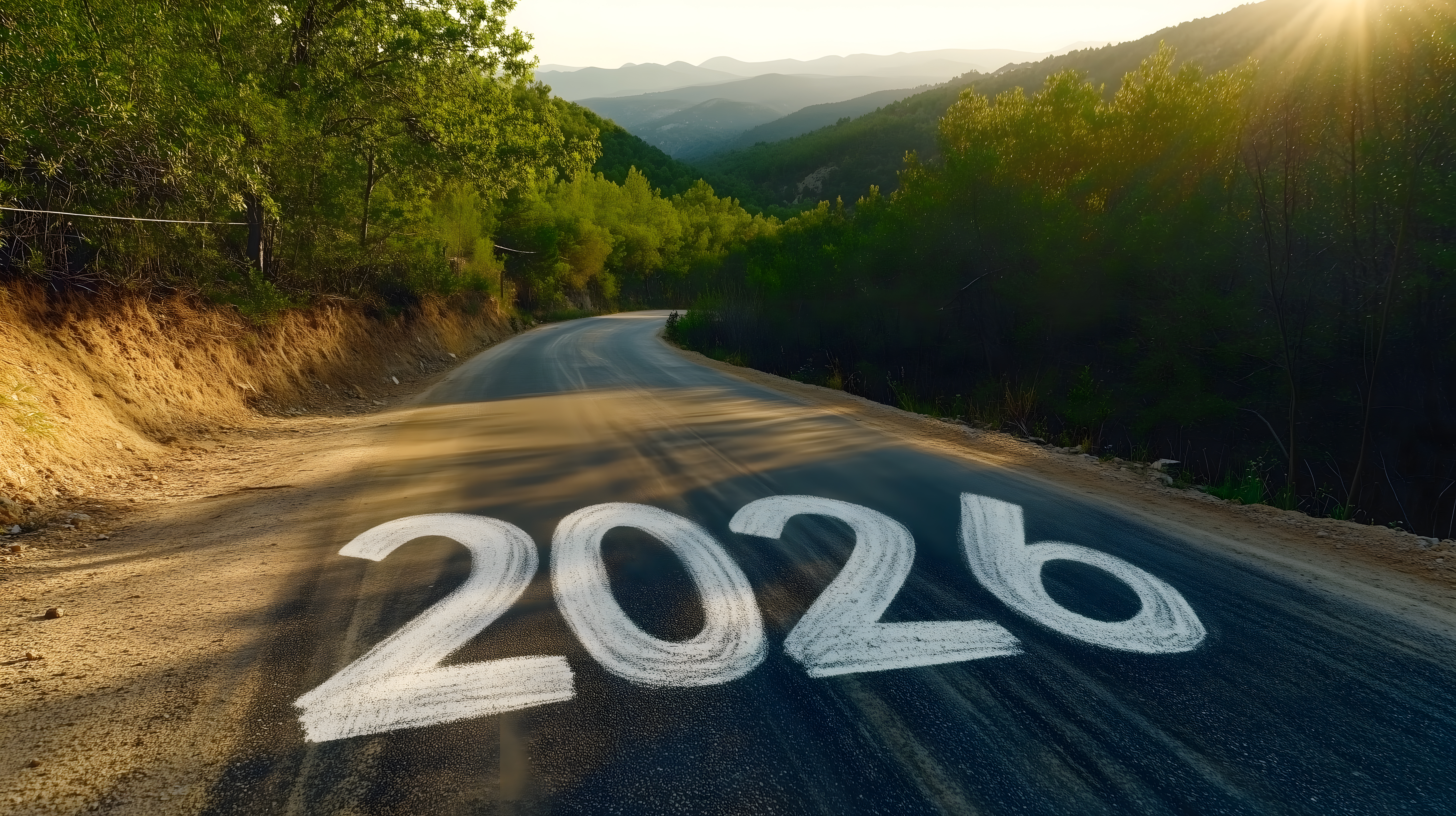 Das Bild zeigt eine kurvenreiche Bergstraße, die sich durch eine grüne, bergige Landschaft schlängelt. In der Ferne sind weitere bewaldete Hügel und Berge zu sehen, die in der warmen Abendsonne leuchten. Auf der Straße ist das Jahr '2026' in großen Zahlen aufgemalt, was eine Zukunftsperspektive andeutet. Das Foto vermittelt eine Atmosphäre von Freiheit, Abenteuer und Urlaubsstimmung und eignet sich hervorragend als kostenloses Stockfoto für Blogs, Newsletter, Social-Media-Beiträge oder Werbematerialien mit einem natürlichen, landschaftlichen Motiv in hoher Auflösung unter Creative-Commons-Lizenz.