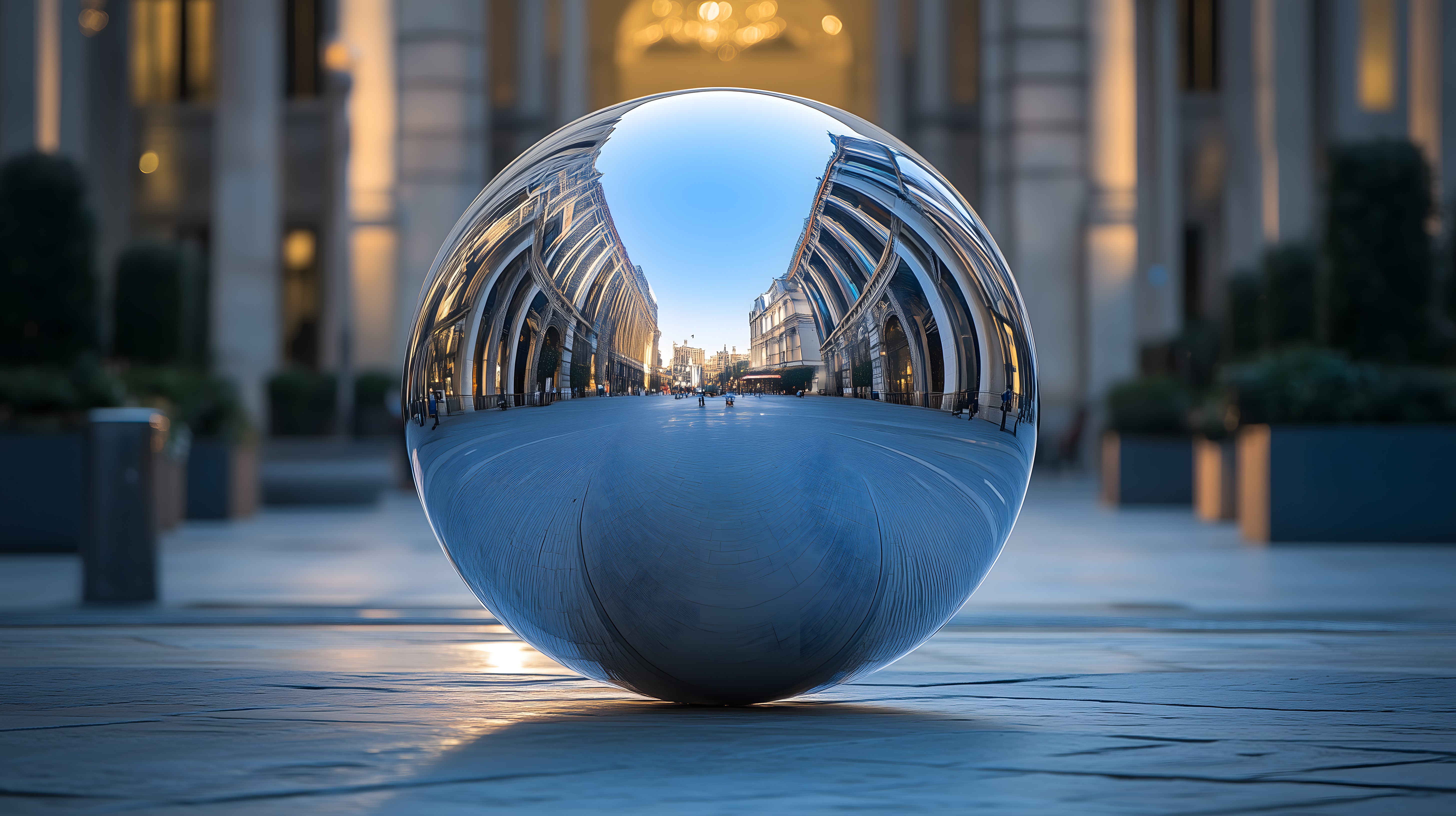 Dieses Foto zeigt eine glänzende Metallkugel, die auf einer leeren Straße zwischen modernen Gebäudefassaden platziert ist. Die Kugel reflektiert die umliegende Architektur, wodurch eine symmetrische und abstrakte Komposition entsteht. Das Bild spielt mit Perspektiven, Reflexionen und Licht, um ein futuristisches und konzeptionelles Motiv zu schaffen. Diese hochauflösende Fotografie eignet sich hervorragend als Hintergrund oder Designelement für Blogs, Newsletter, Social-Media-Beiträge und Werbematerial. Das Stockfoto ist unter einer Creative-Commons-Lizenz frei nutzbar.