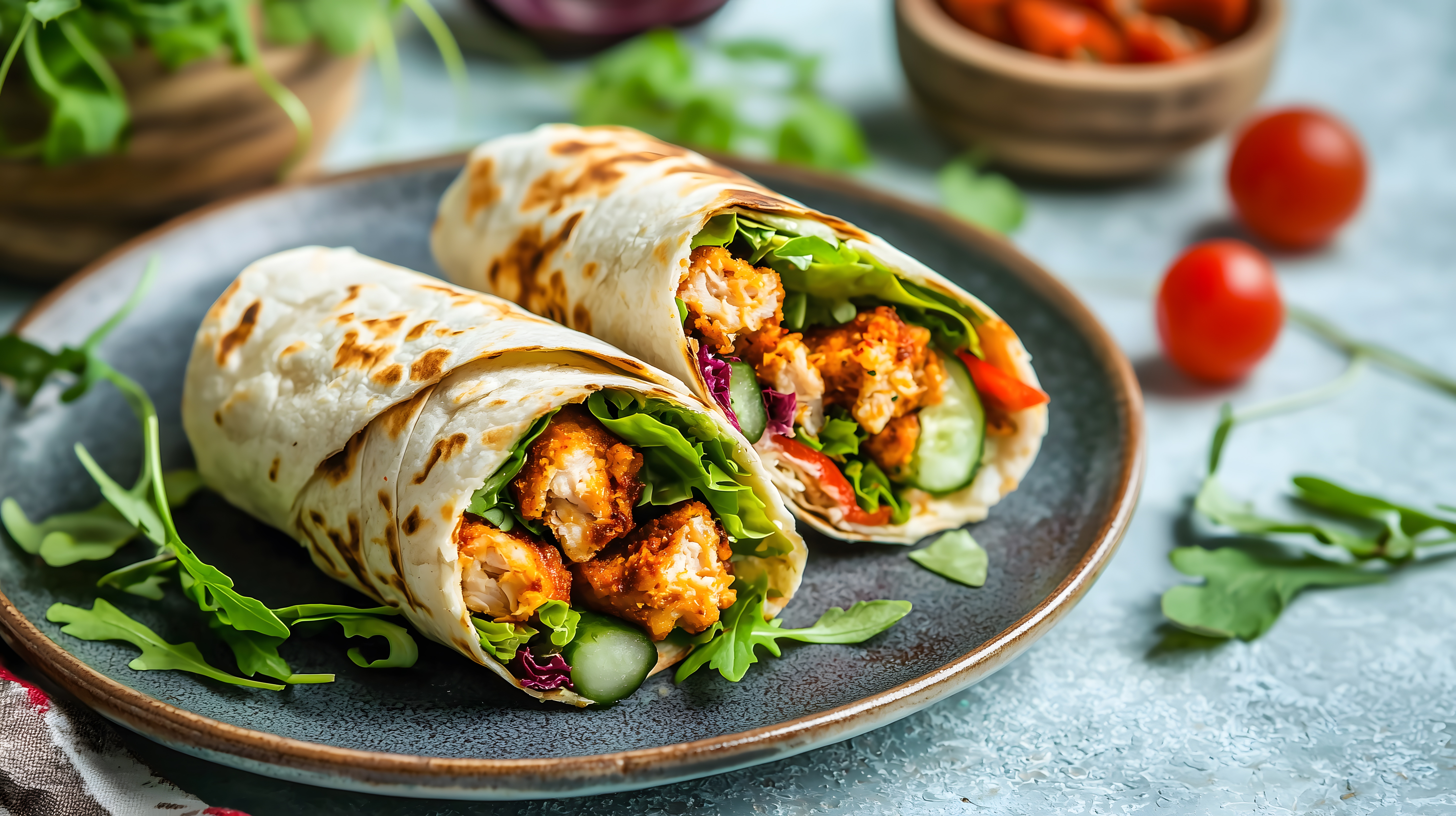 Dieses köstliche Foto zeigt frisch zubereitete Wraps gefüllt mit knuspriger Hähnchenfüllung und frischem Gemüse. Die Wraps sind ansprechend auf einem rustikalen Teller angerichtet, umgeben von weiteren Zutaten wie Tomaten, Gurken und Salat. Das Gericht strahlt eine appetitliche, leicht mexikanische Note aus und eignet sich hervorragend als Snack, Mittagessen oder leichter Abendessen. Dieses hochwertige Stockfoto in hoher Auflösung ist unter Creative-Commons-Lizenz für private und kommerzielle Zwecke frei nutzbar.