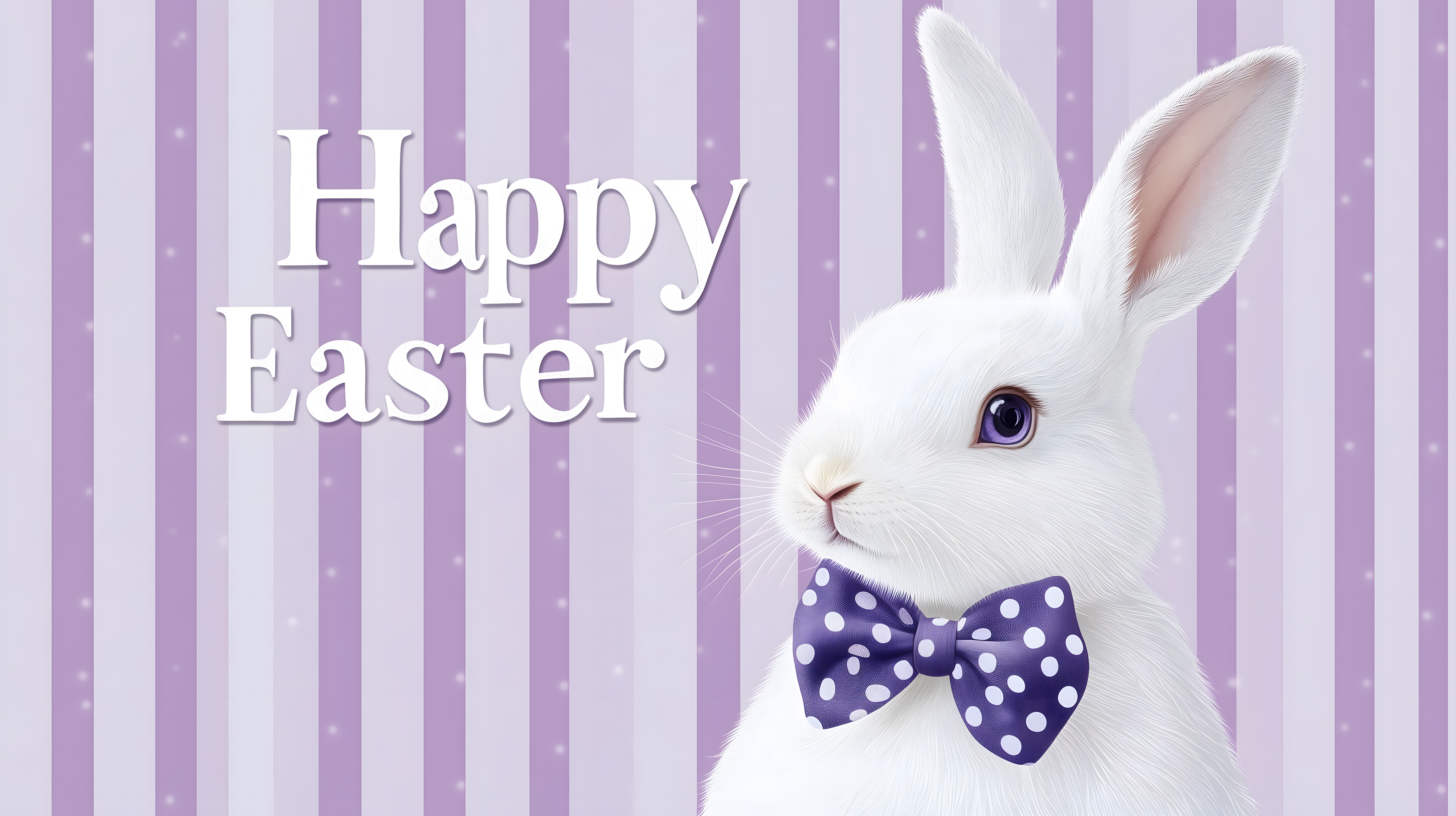 Das Bild zeigt einen weißen Osterhasen mit lila Fliege vor einem lila-gestreiften Hintergrund mit glitzernden Akzenten. Der Hase hat große, aufmerksame Augen und sieht sehr süß und einladend aus. Das Foto eignet sich perfekt als Titelbild oder Illustration für Ostergrüße, Einladungen oder Dekorationen auf Blogs, in Newslettern oder sozialen Medien. Als hochauflösendes, kostenloses Stockfoto unter Creative Commons-Lizenz kann es vielfältig in Projekten eingesetzt werden.