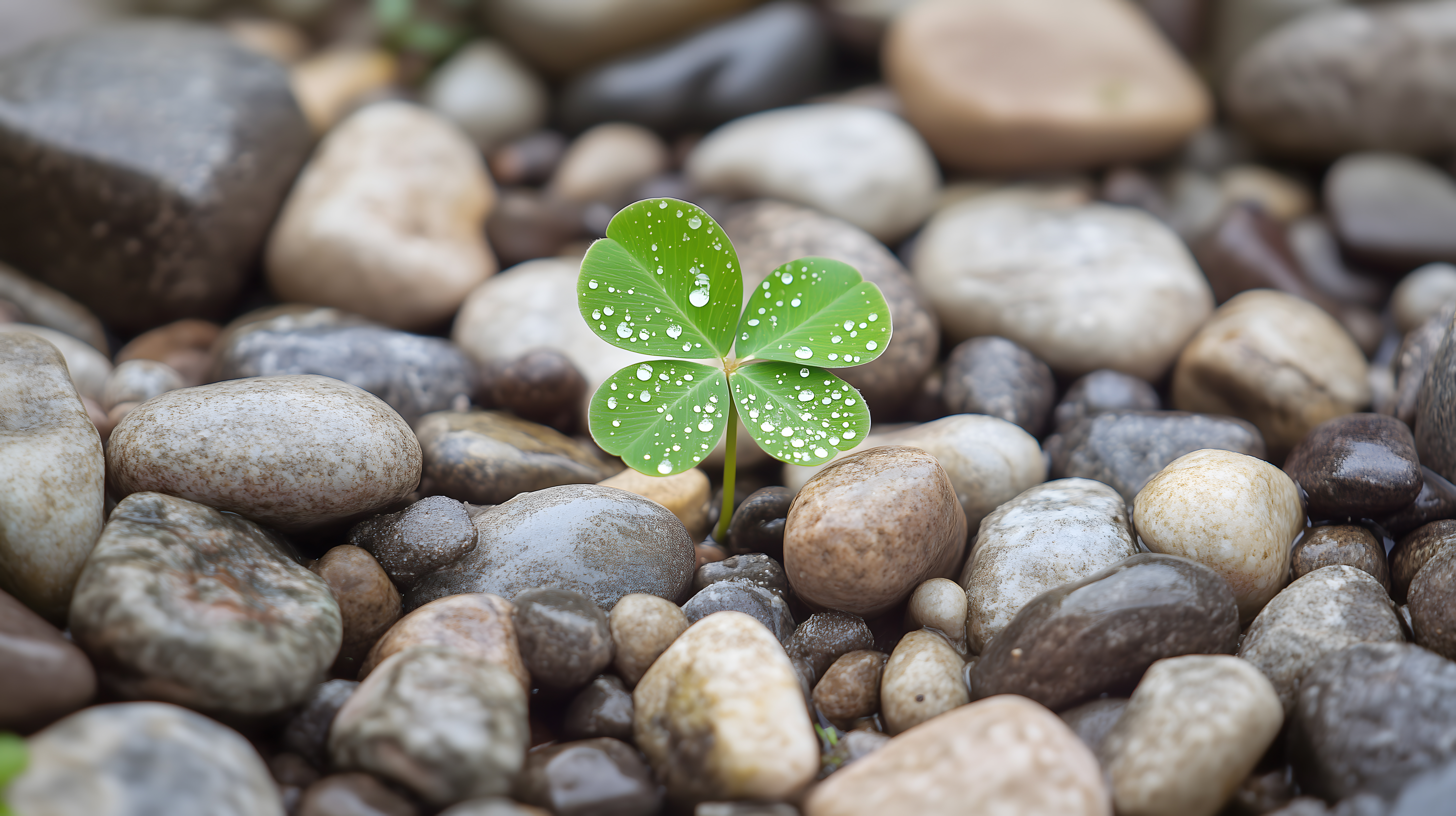 Das Foto zeigt einen frischen vierblättrigen Kleehalm, der inmitten von Kieselsteinen wächst. Die grünen Blätter des Kleeblatts sind mit glitzernden Regentropfen überzogen, die das Bild mit einem feuchten, natürlichen Look versehen. Die Komposition ist minimalistisch und fokussiert sich ganz auf den Kontrast zwischen dem lebendigen Grün des Kleeblatts und den erdigen, grauen Steinen. Dieses Stockfoto eignet sich hervorragend für den Einsatz in Blogbeiträgen, Newsletter-Designs oder Social-Media-Posts, die ein natürliches, frisches und glückliches Thema transportieren möchten. Es ist in hoher Auflösung und unter der Creative-Commons-Lizenz verfügbar.