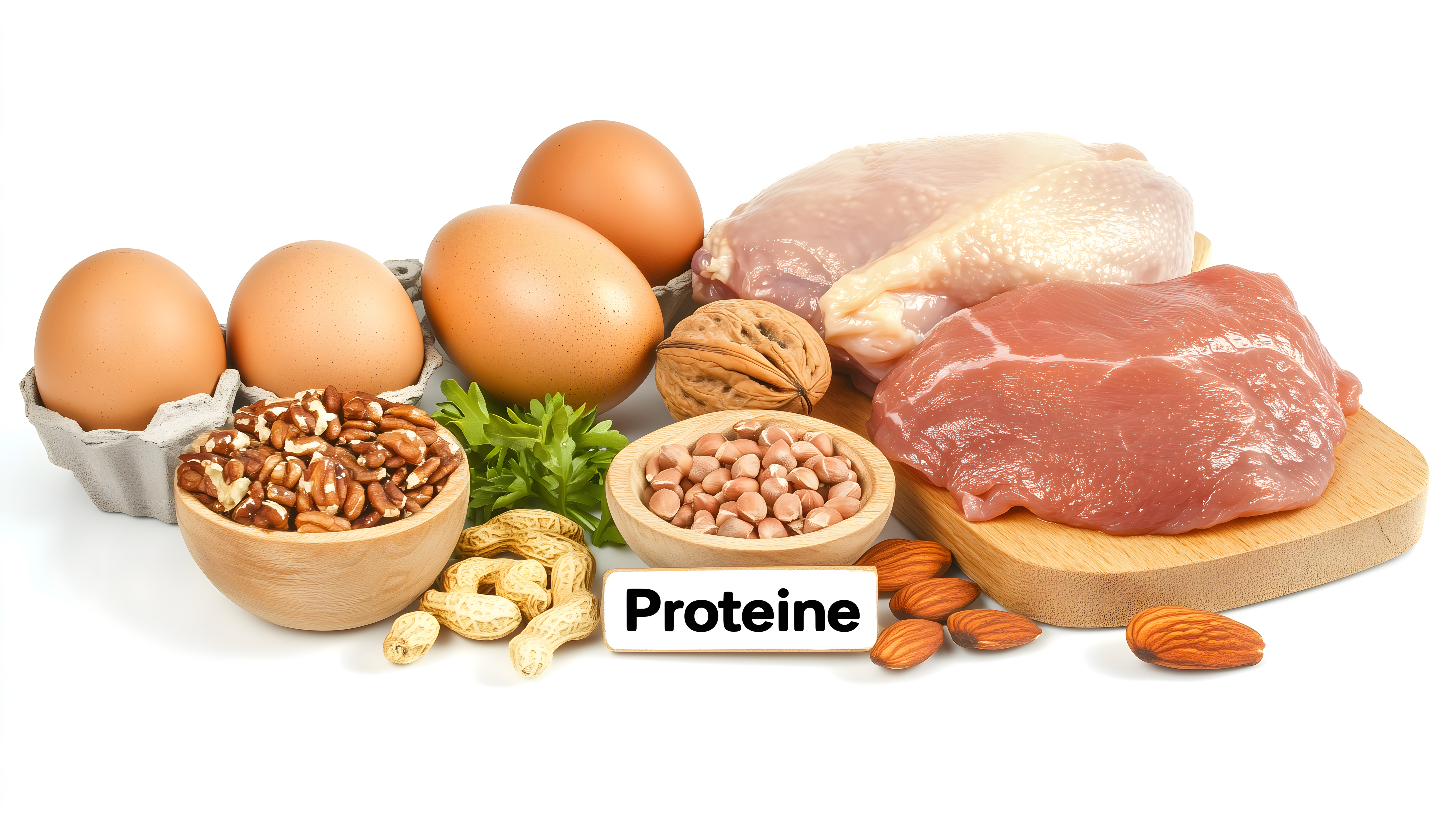 Dieses Foto zeigt eine Auswahl an proteinreichen Lebensmitteln auf einem hellen Hintergrund. Im Vordergrund sind Eier, Hühnchenfleisch und verschiedene Nüsse wie Walnüsse und Mandeln zu sehen. Die Anordnung auf einem Holzbrett erzeugt eine natürliche, ruhige Atmosphäre. Das Bild ist ideal für den Einsatz in Artikeln oder Social-Media-Beiträgen zum Thema gesunde Ernährung, Fitness oder Kochen. Als kostenloses Stockfoto in hoher Auflösung und unter Creative-Commons-Lizenz kann es frei für vielfältige Zwecke genutzt werden.