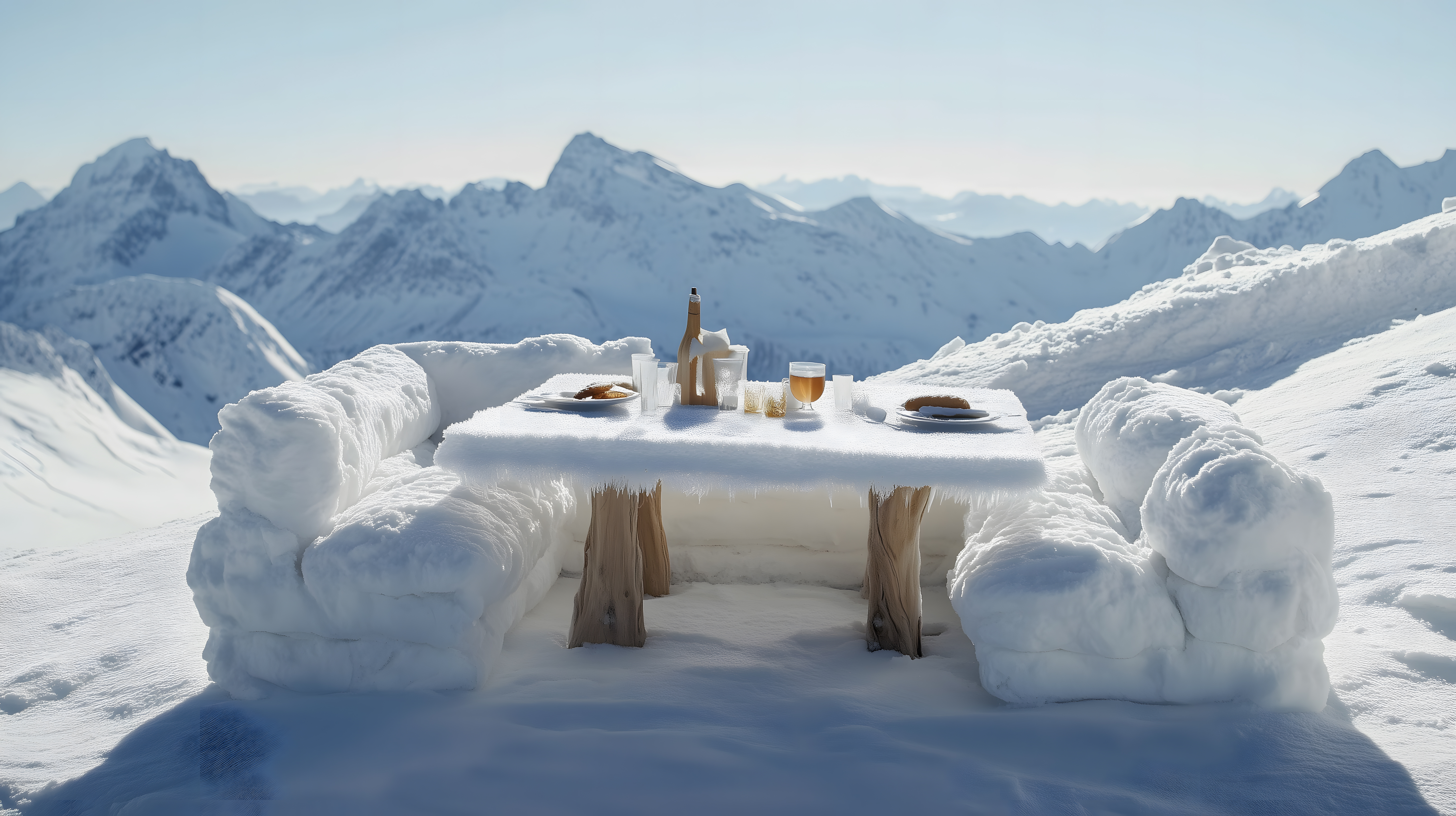 Dieses beeindruckende Foto zeigt eine traumhafte Bergkulisse mit schneebedeckten Gipfeln im Hintergrund. Vor dieser majestätischen Szenerie befindet sich ein gedeckter Tisch mit Speisen und Getränken, der zum gemütlichen Verweilen einlädt. Die Kombination aus der faszinierenden Winterlandschaft und dem stimmungsvollen Essen schafft eine einzigartige Atmosphäre der Entspannung und des Genusses. Dieses hochauflösende Stockfoto unter Creative-Commons-Lizenz eignet sich perfekt für Blogs, Newsletter, Social-Media-Beiträge oder Werbematerialien, die eine besondere Naturästhetik und Gemütlichkeit vermitteln möchten.