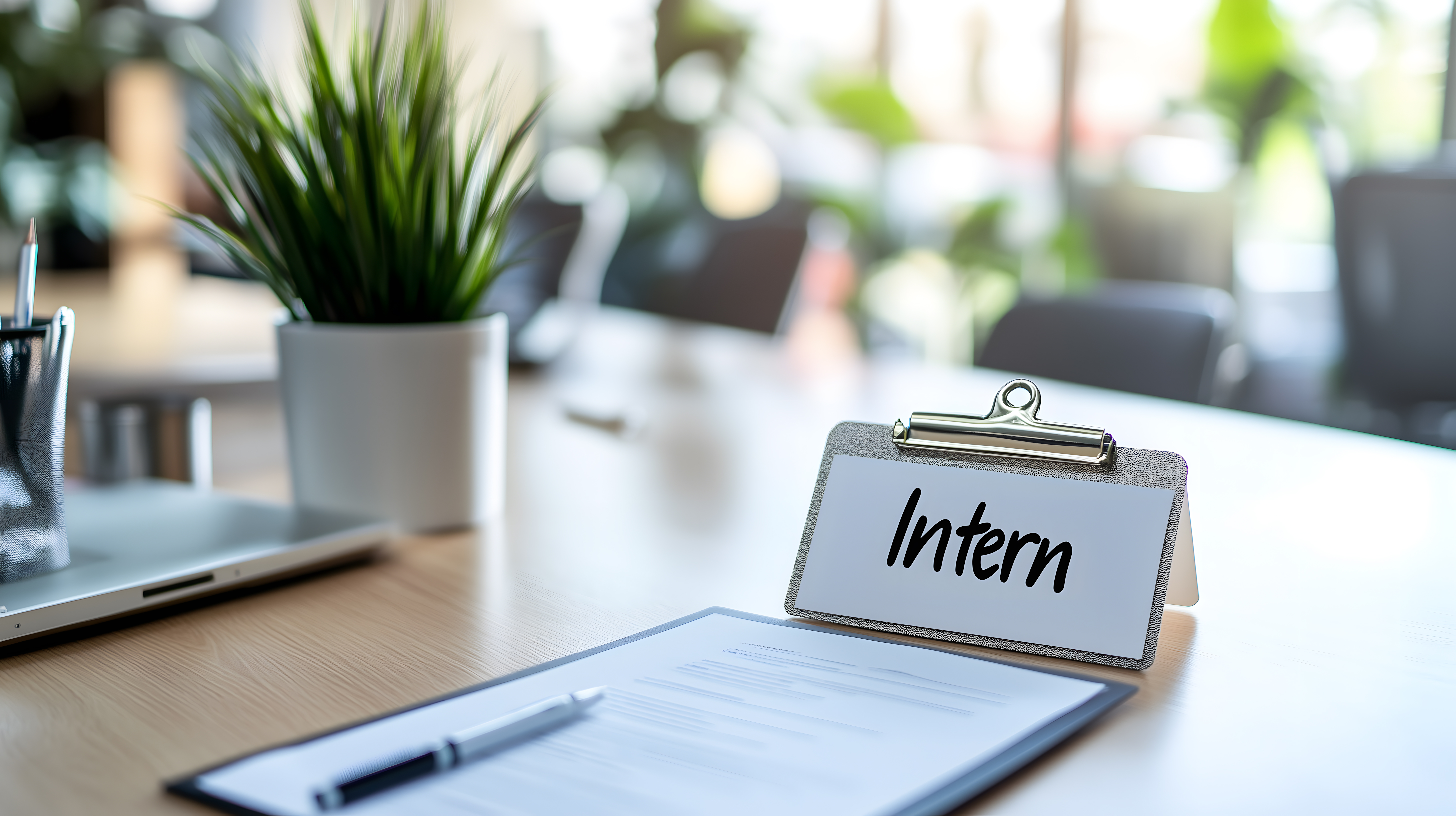 Das Foto zeigt einen modernen, aufgeräumten Büroraum mit einem Schreibtisch, auf dem sich ein Laptop, eine Pflanze in einem weißen Topf sowie weitere Büromaterialien befinden. Auf einer Zwischenüberschrift ist das Wort 'Intern' zu lesen, was darauf hindeutet, dass dieser Arbeitsplatz für einen Praktikanten oder eine Praktikantin genutzt wird. Das Ambiente ist sehr aufgeräumt und strukturiert, was die Konzentration und Produktivität der Arbeit fördern kann. Das Foto eignet sich hervorragend als kostenloses Stockfoto für Beiträge rund um Themen wie Bürokultur, Praktika, Ausbildung und Karriere in hoher Auflösung und unter Creative-Commons-Lizenz.